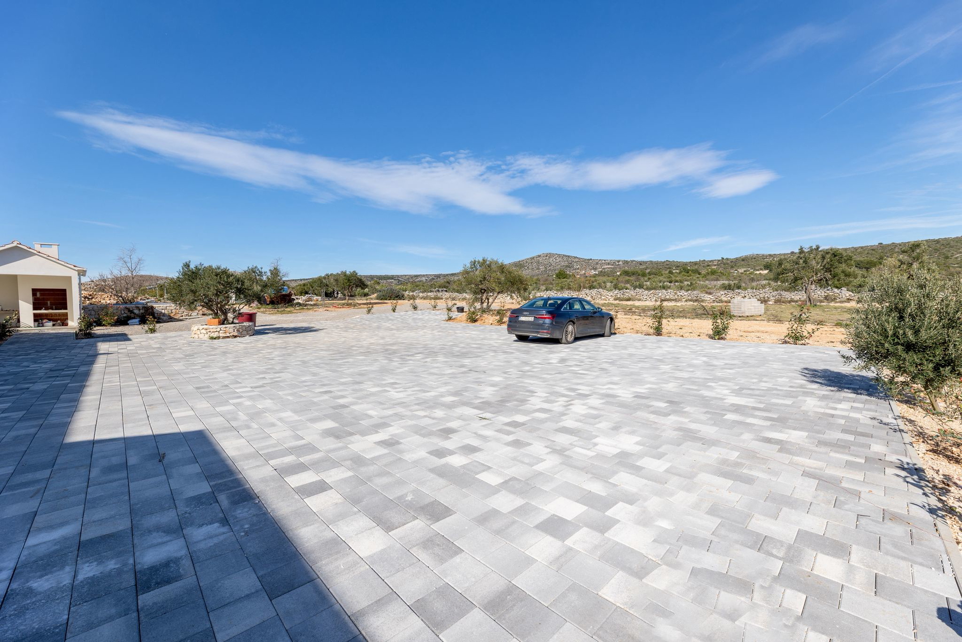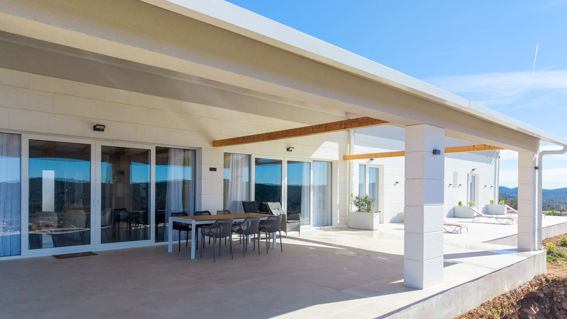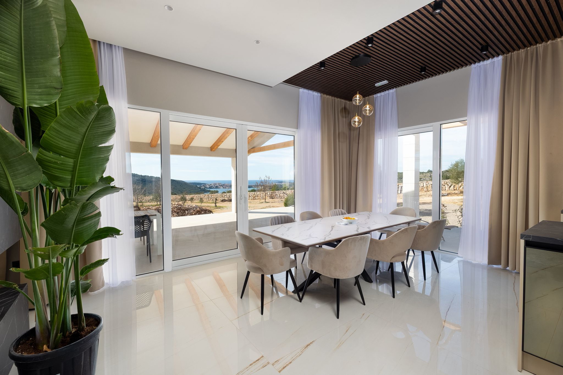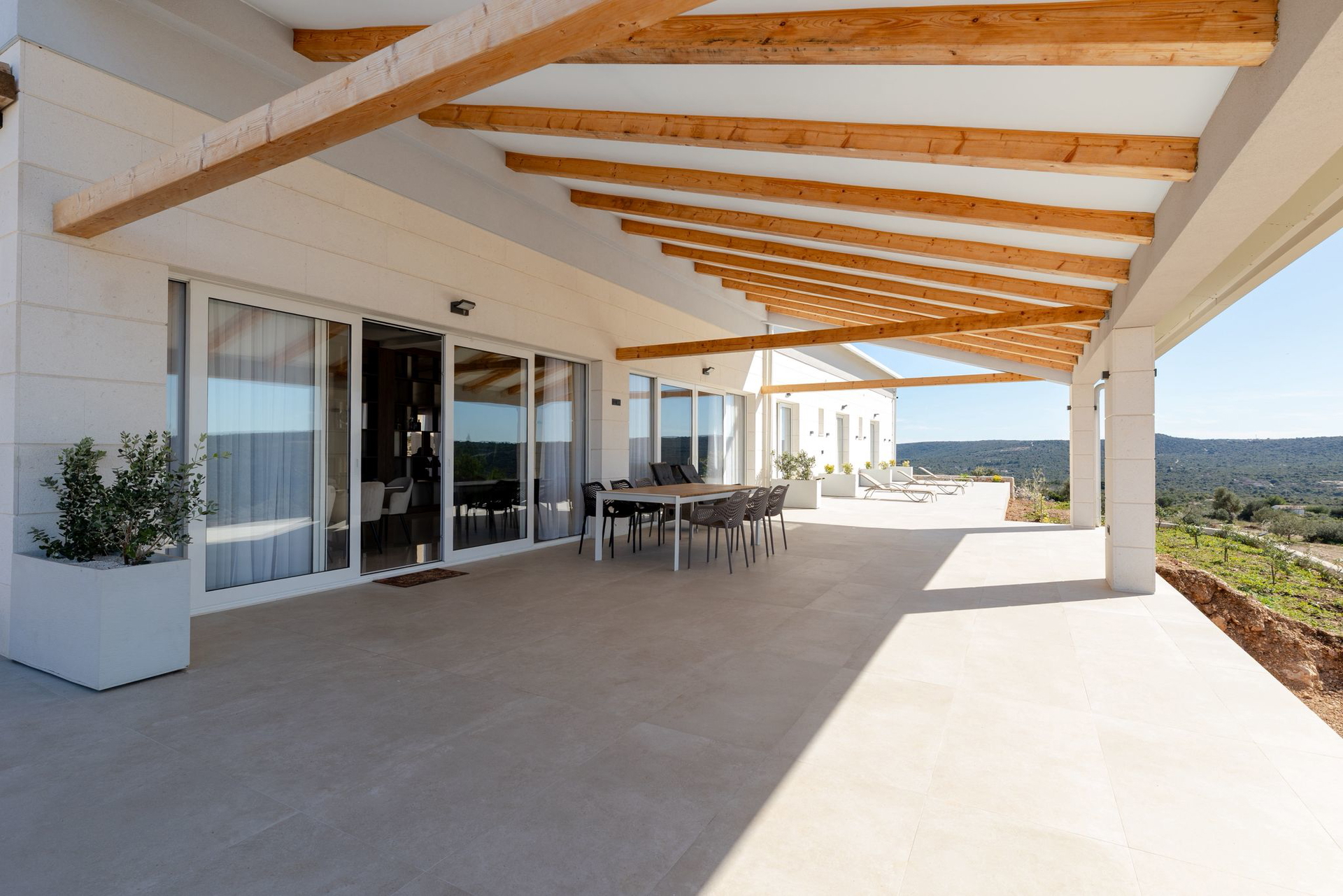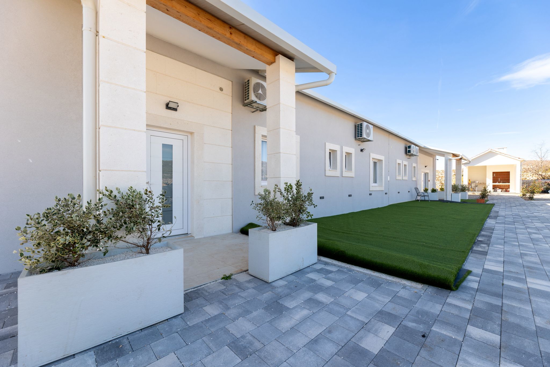 Der Außenbereich wird sorgfältig gestaltet, mit mediterranen Pflanzen, Olivenbäumen und Immortellen, um eine perfekte Atmosphäre zur Entspannung zu schaffen.