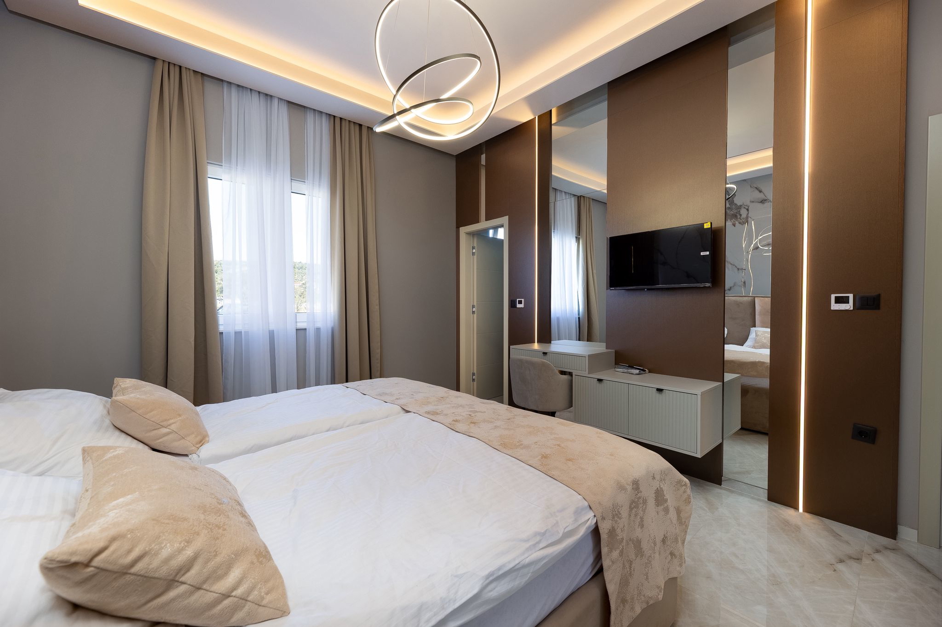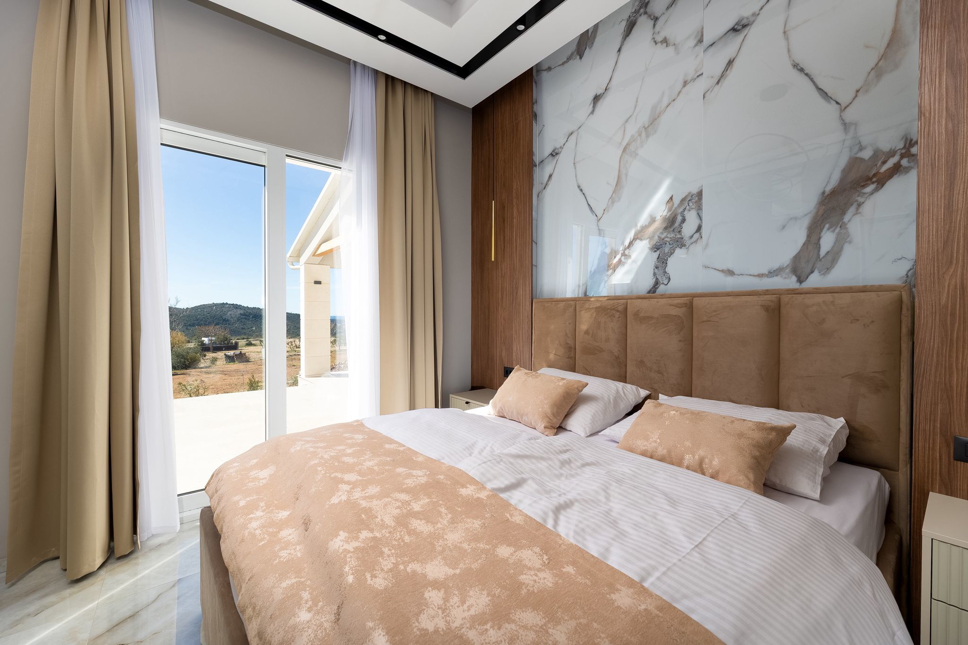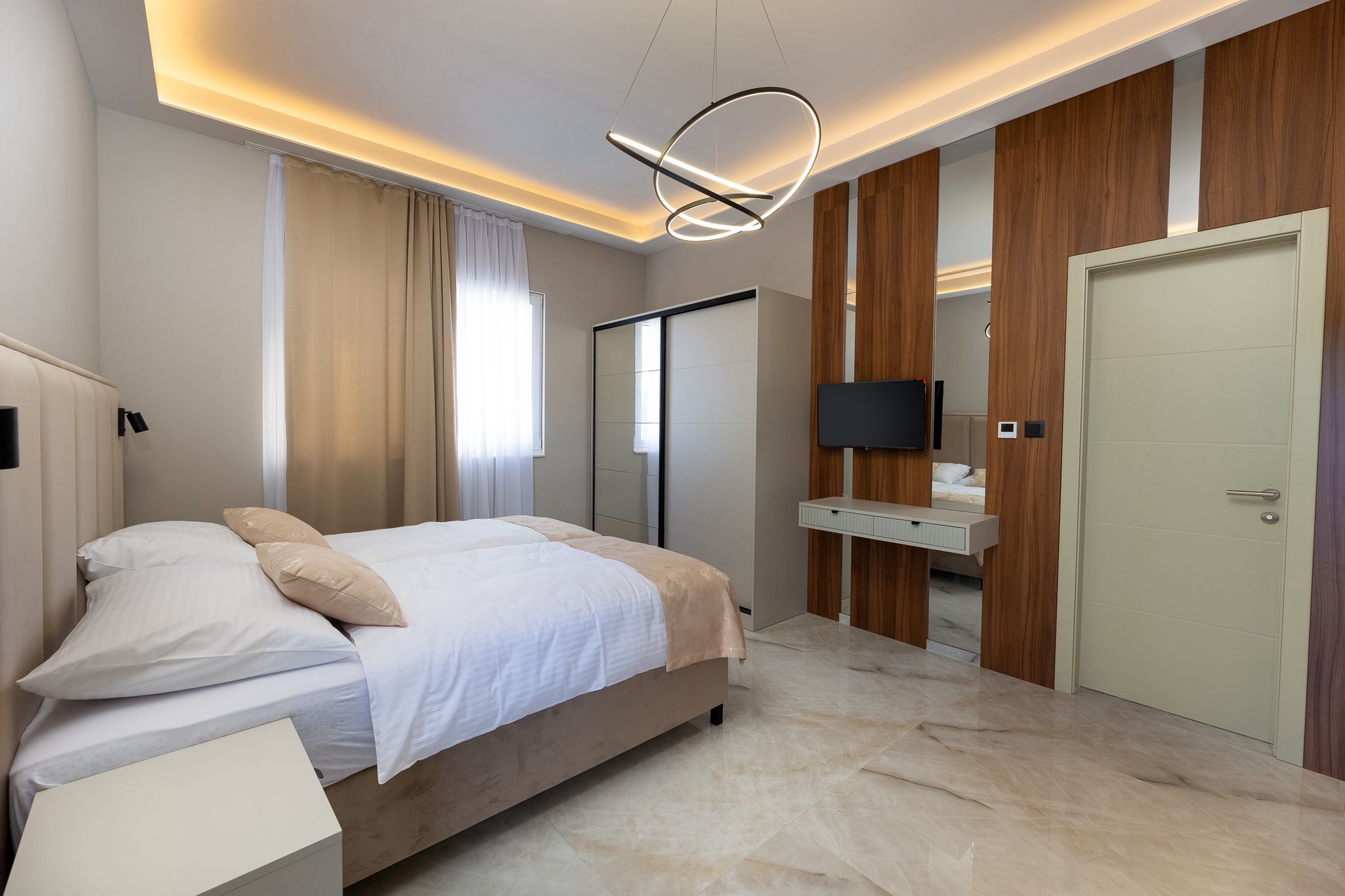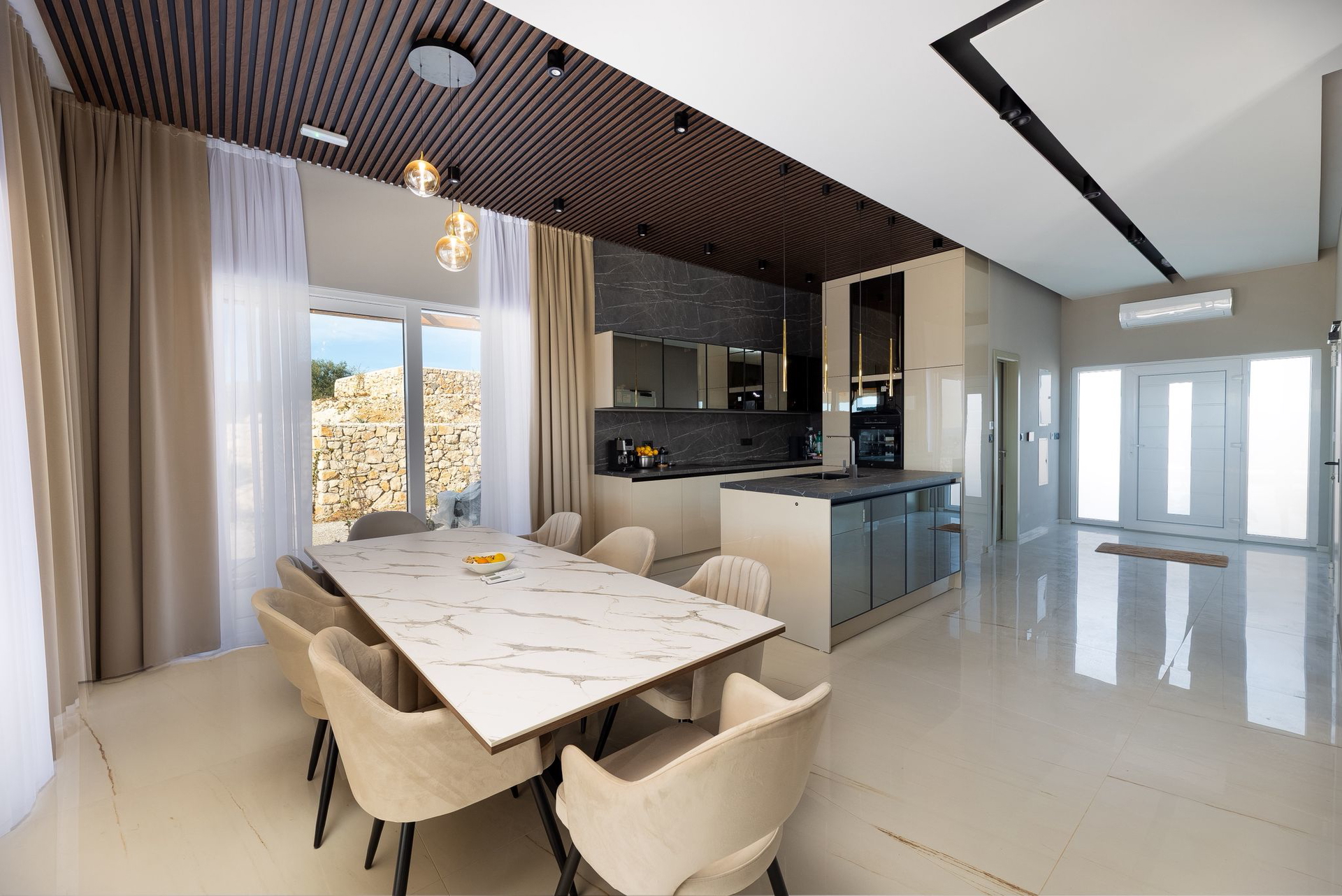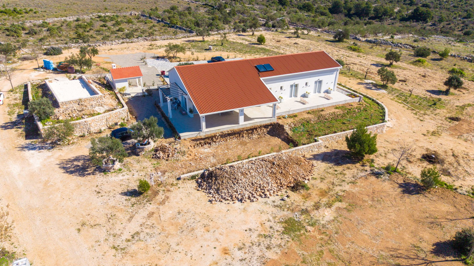 Der Außenbereich wird sorgfältig gestaltet, mit mediterranen Pflanzen, Olivenbäumen und Immortellen, um eine perfekte Atmosphäre zur Entspannung zu schaffen.