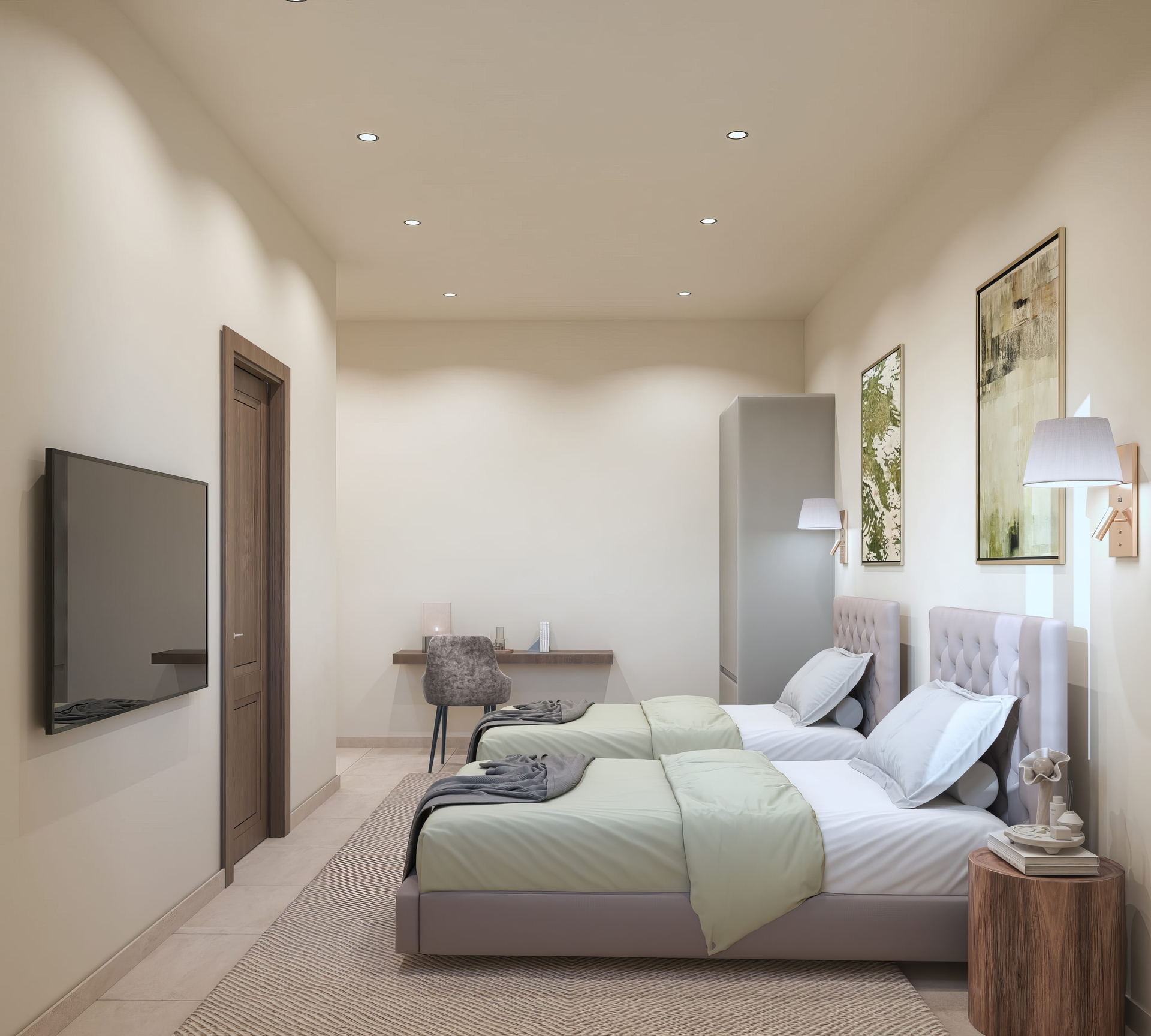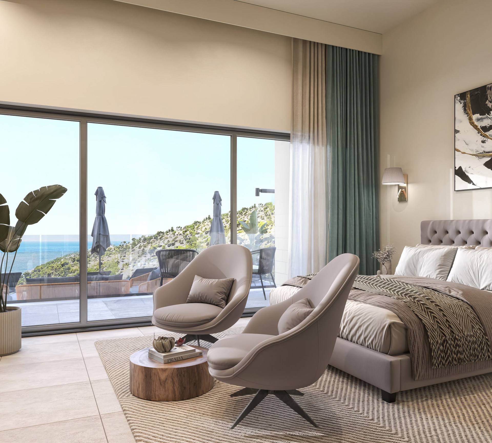 Das Erdgeschoss besteht aus einem großzügigen Wohnzimmer mit Essbereich, Küche, sechs Schlafzimmern, jeweils mit eigenem Bad und begehbarem Kleiderschrank, zusätzlich zwei WCs sowie zwei großen Terrassen auf der Südseite, die einen bezaubernden Meerblick bieten.