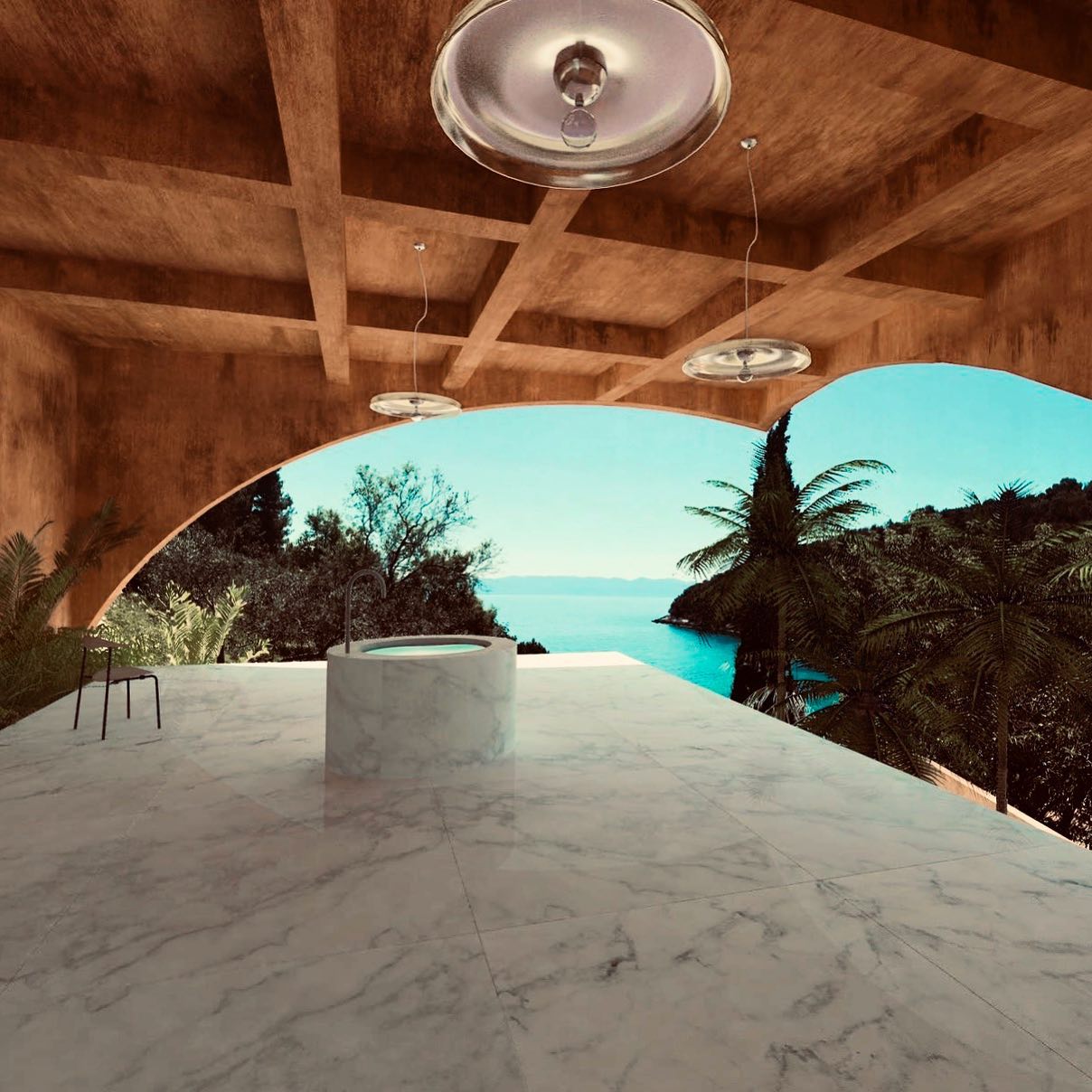 Erdgeschoss: Sommerküche mit Kamin, überdachte Terrasse, großzügiges offenes Wohnzimmer mit Panoramablick auf das Meer, Gäste-WC.