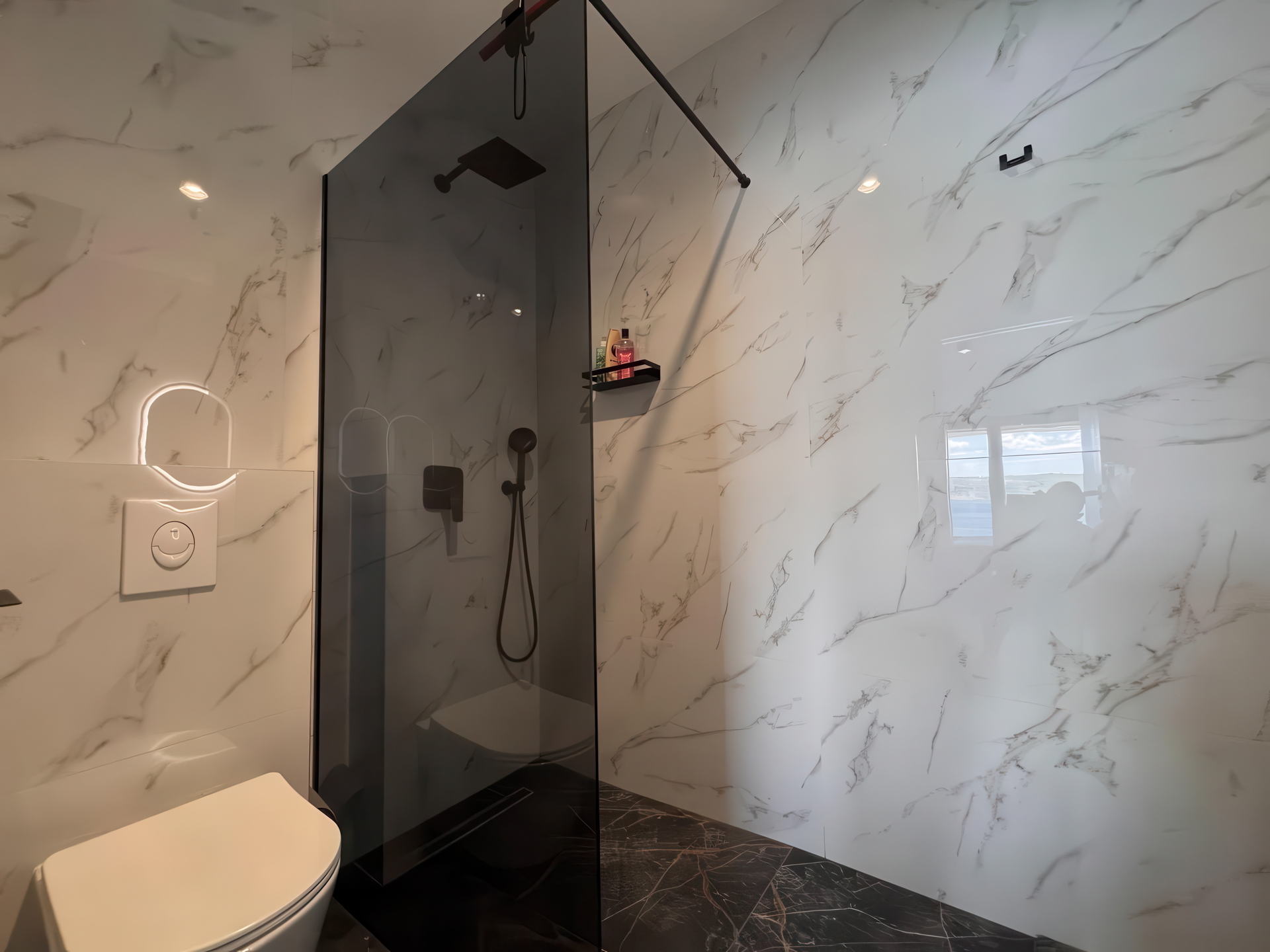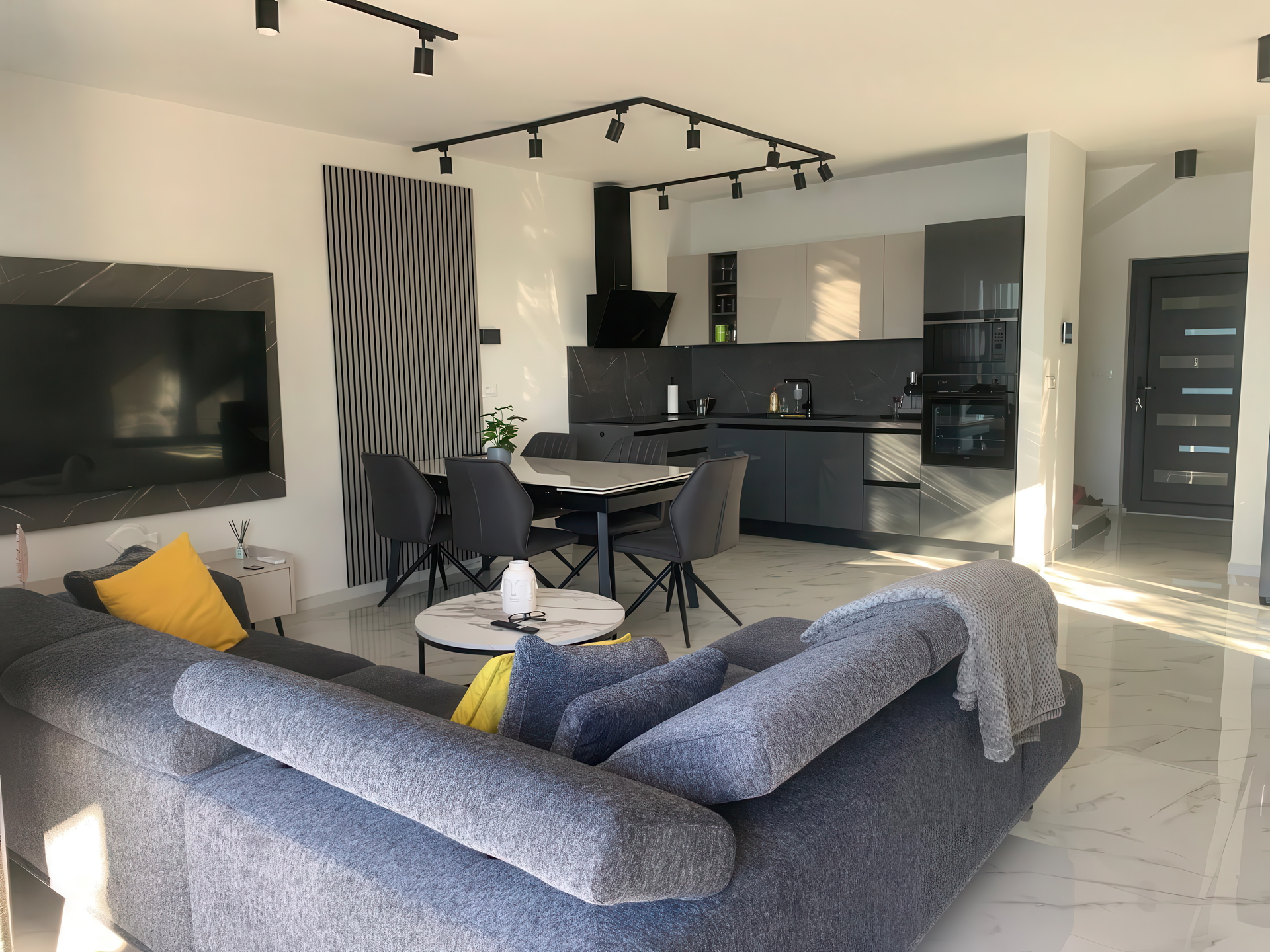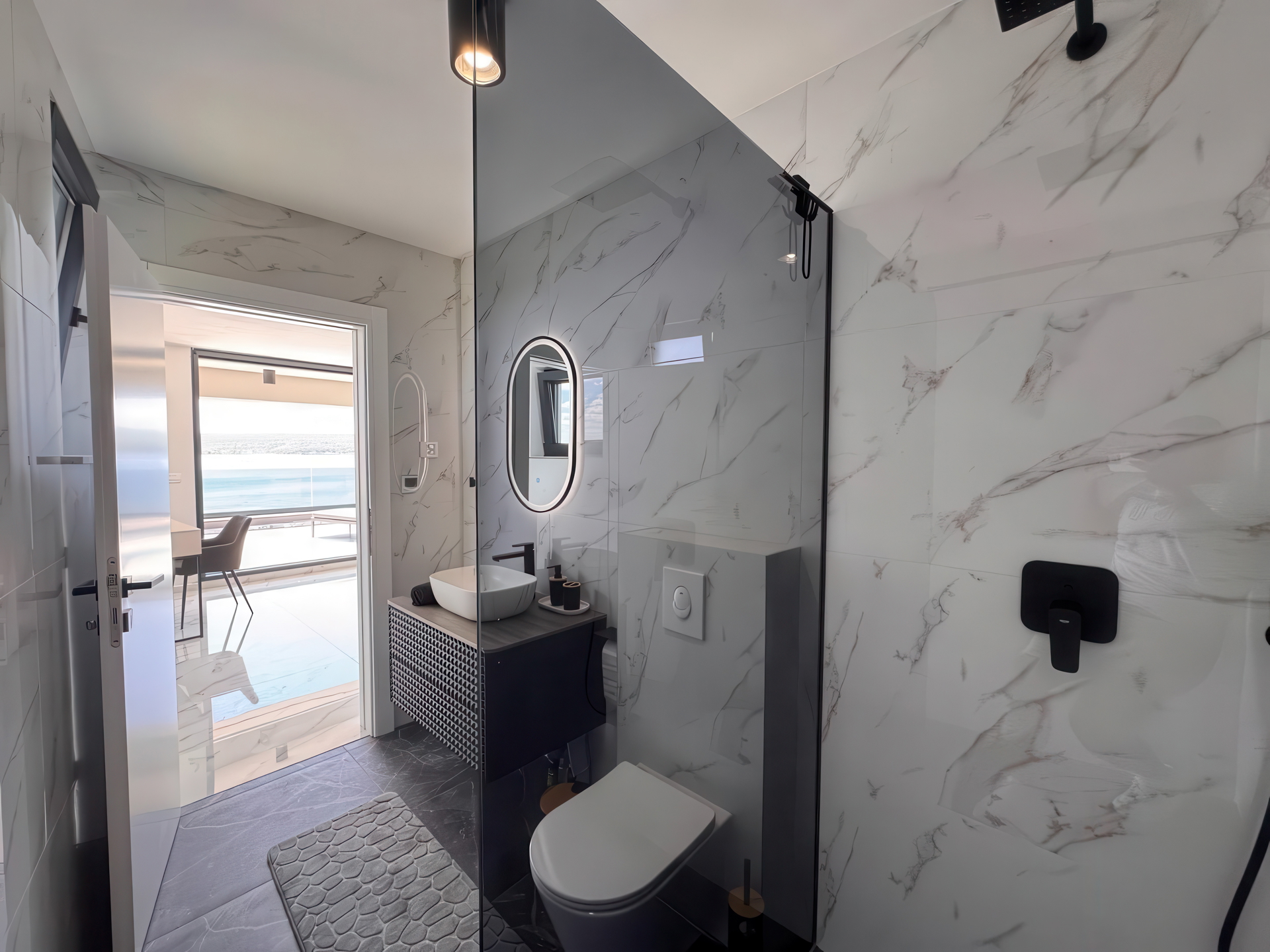 Im Erdgeschoss befindet sich ein großzügiger Wohnbereich mit offenem Konzept, der Küche, Esszimmer und Wohnzimmer vereint, mit direktem Zugang zur Terrasse und Meerblick. Auf derselben Etage befinden sich zudem eine Gästetoilette sowie ein multifunktionaler Raum mit separatem Eingang – ideal als privates Fitnessstudio, Sauna oder Büro, je nach den Bedürfnissen des zukünftigen Eigentümers.