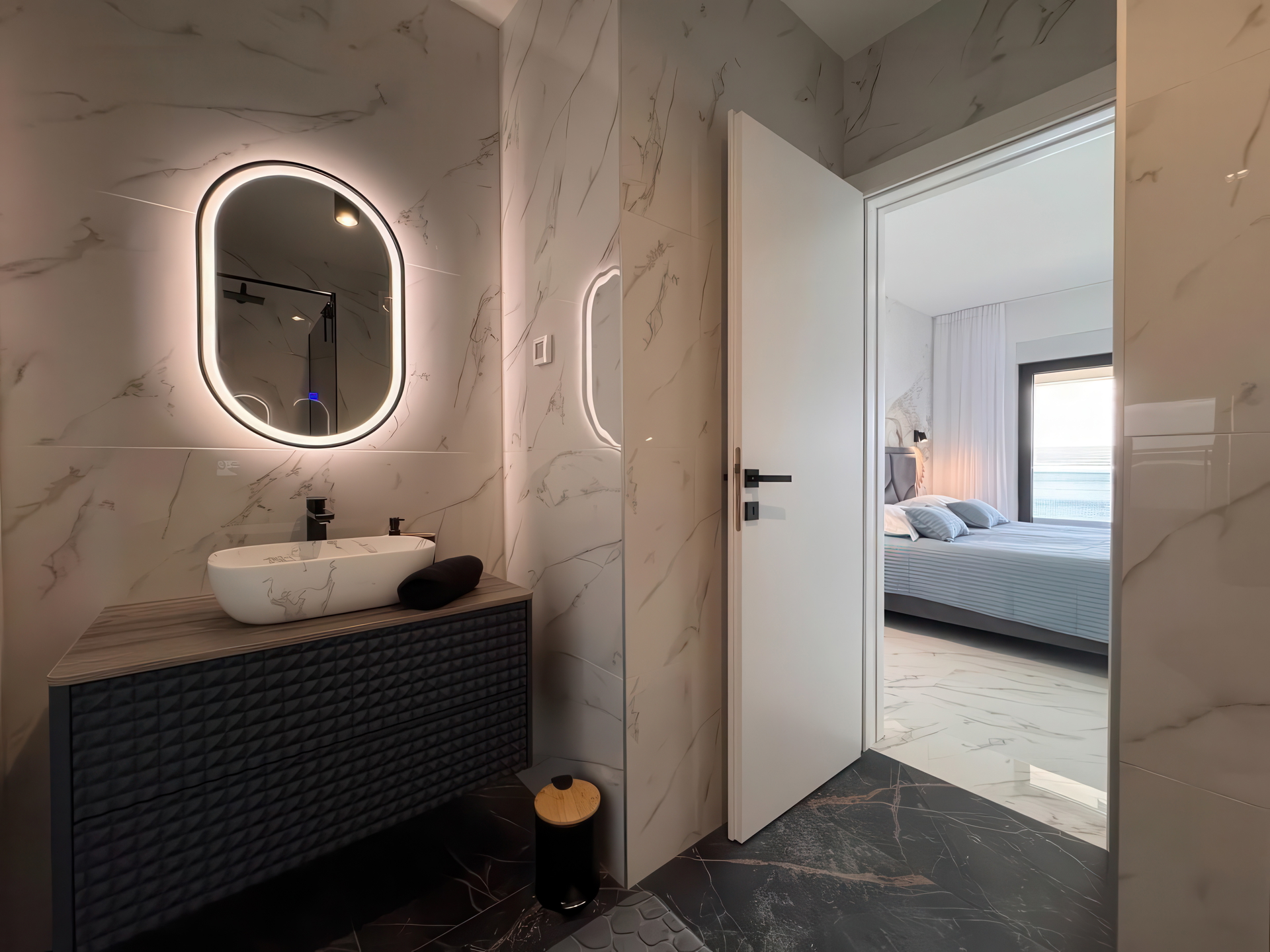 Das erste Obergeschoss ist für zwei komfortable Schlafzimmer reserviert, jedes mit eigenem Badezimmer und Zugang zur gemeinsamen Terrasse, die einen intimen Raum für den Morgenkaffee oder die abendliche Entspannung bietet.