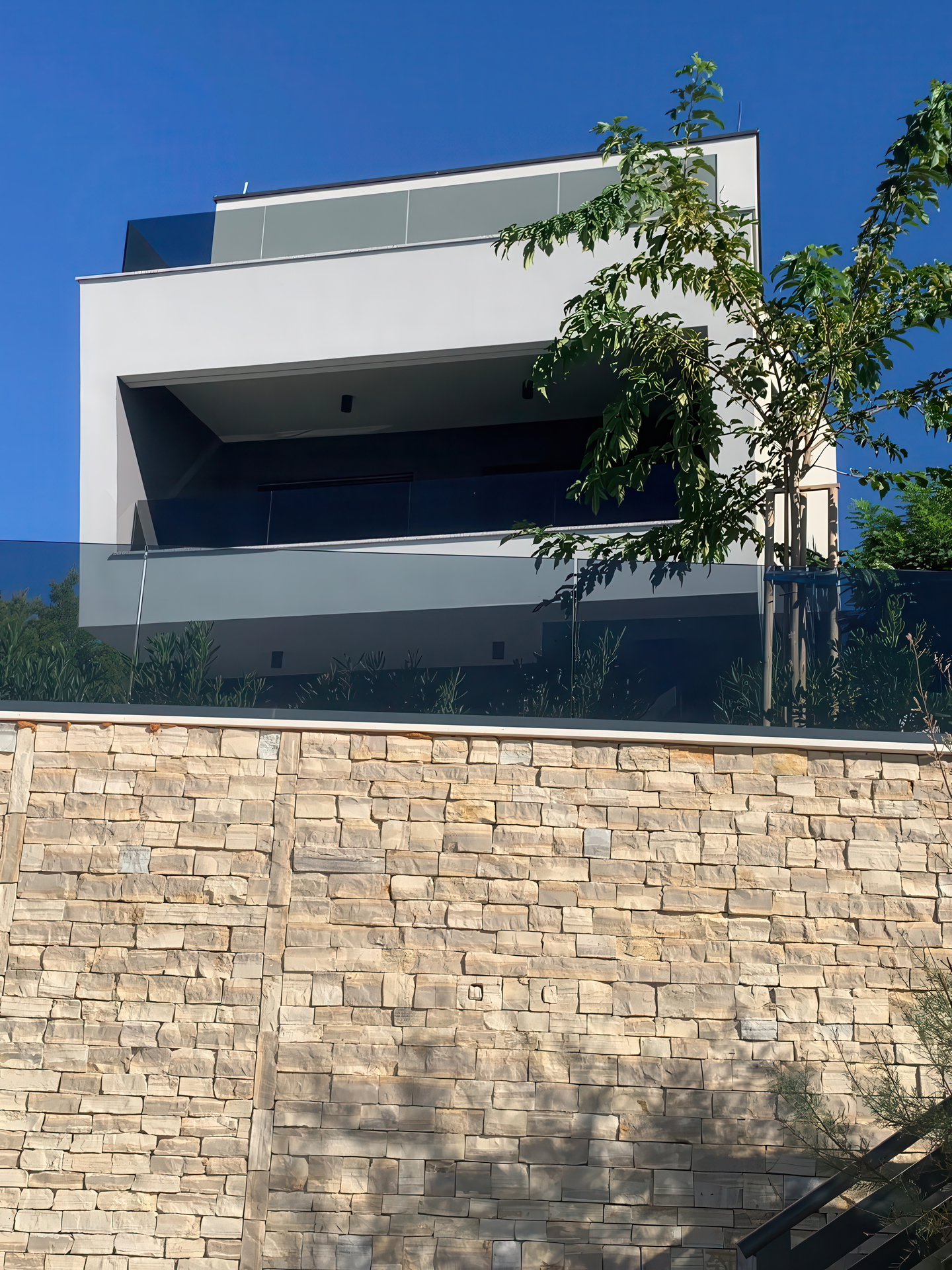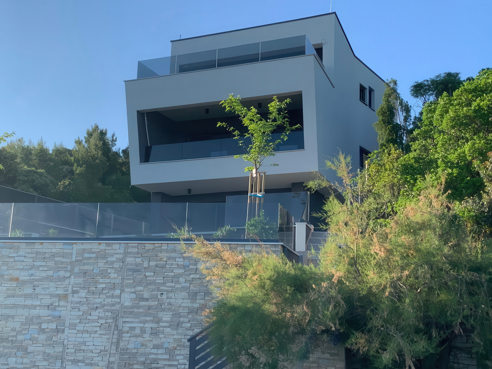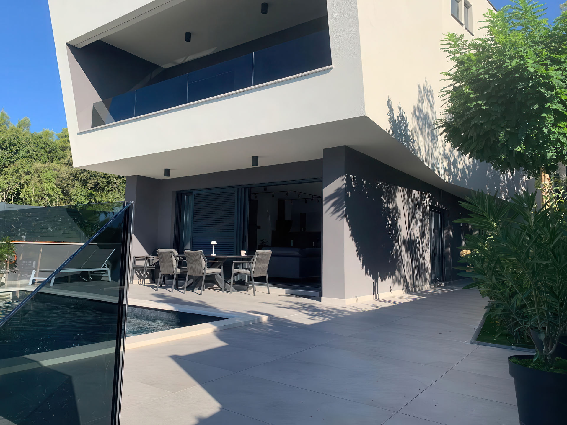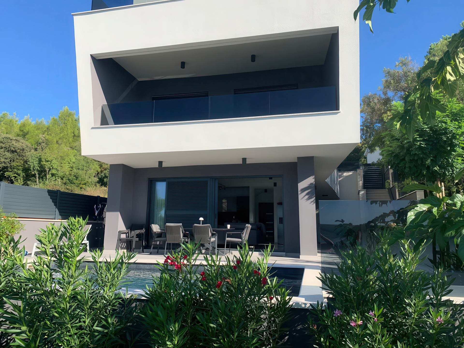 Der Außenbereich der Villa ist ebenso beeindruckend wie das Interieur. Ein gepflegter mediterraner Garten mit Oleandern und Zierbäumen schafft eine harmonische Atmosphäre, während der Außenbereich durch einen Pool, eine Sonnenterrasse, eine Lounge-Zone sowie eine Rasenfläche mit Panoramablick bereichert wird.