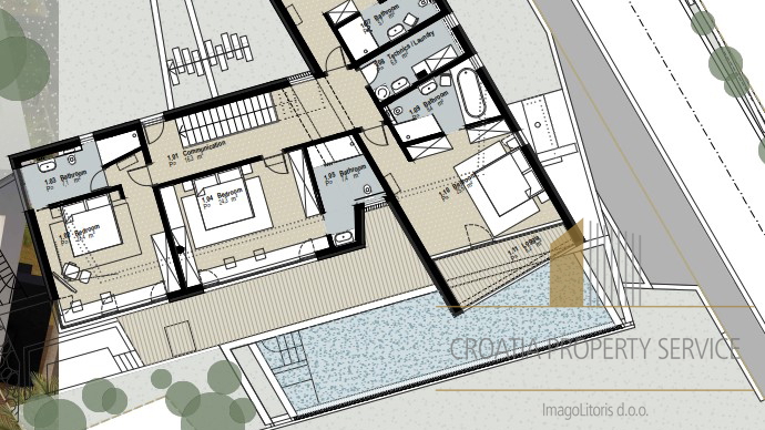On the first floor, there are four bedrooms with en-suite bathrooms and a laundry room. Two of the rooms have their own loggias offering privacy and a beautiful sea view.