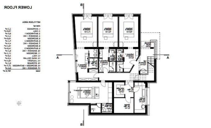 Ground floor: four bedrooms with wardrobes, four bathrooms, hallway, laundry room, wine cellar, storage rooms.