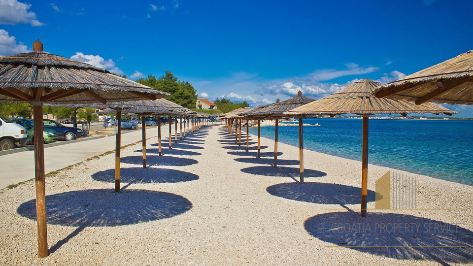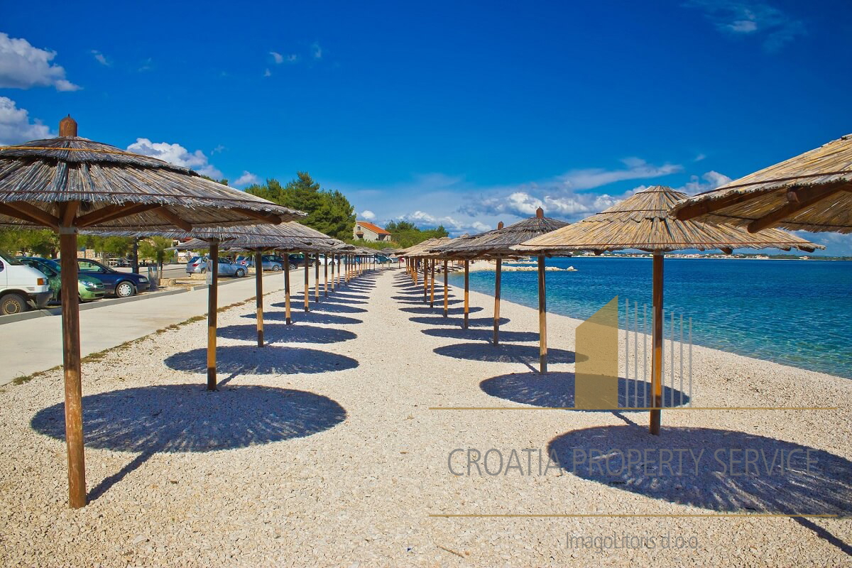 High-quality materials and equipment are used in construction: top-quality ceramics (Ceramiche Piemme), first-class bleached brushed oak parquet (Tarkett), Trogir plano stone, Rehau PVC joinery with shutters and mosquito nets, Laufen and Aquestil sanitary ware, Hörmann garage doors with remote control; the flat roof is constructed using the Draco system, the facade is made of Benkovački Ben stone, thermal insulation thickness 10 cm and 20 cm.