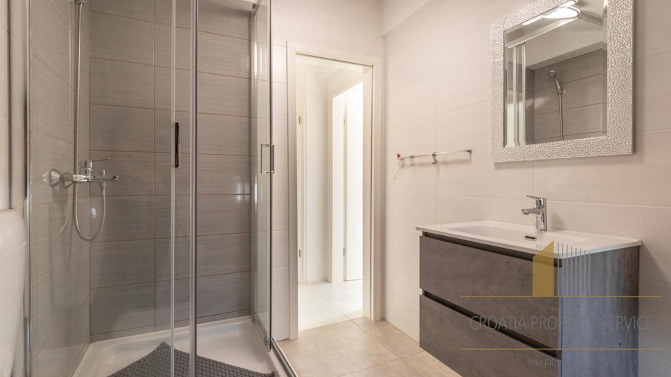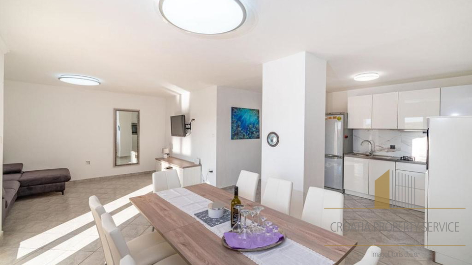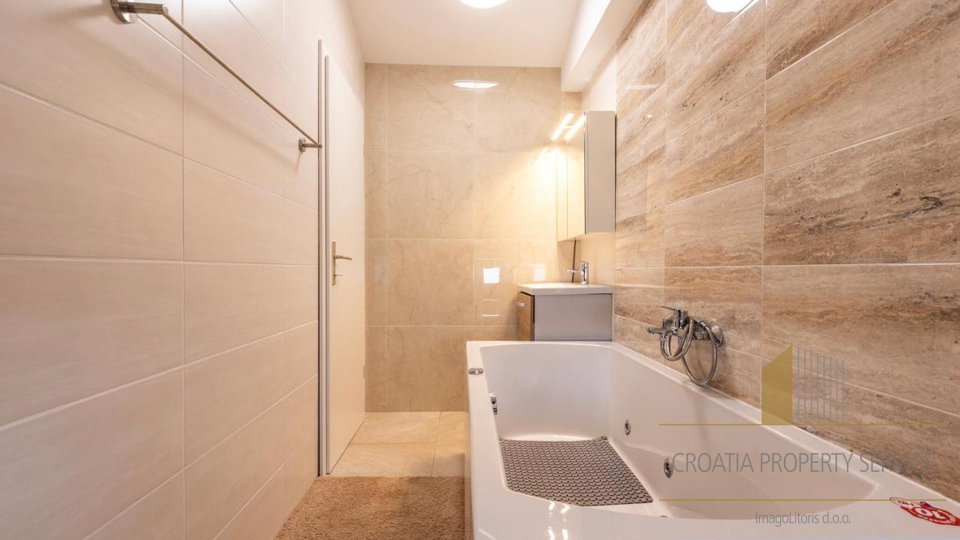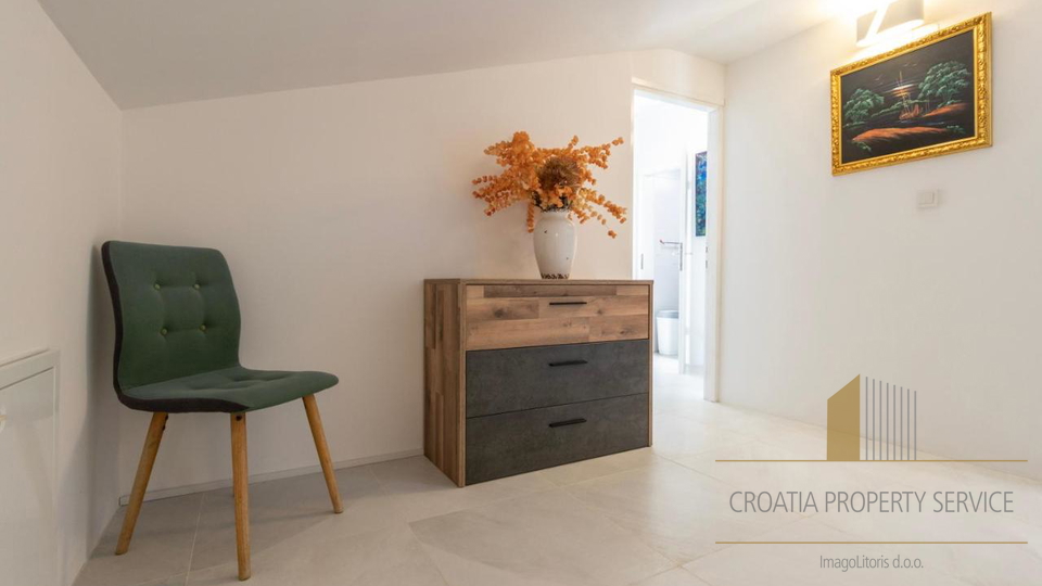 The high attic consists of 3 bedrooms and 2 bathrooms. Each bedroom has its own exit to a spacious terrace with an open view of the sea and the Velebit mountain. Underfloor heating is installed throughout the attic.