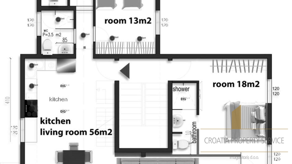 The penthouse comes with two spacious garages, each measuring 17 m2 and an outdoor parking space.