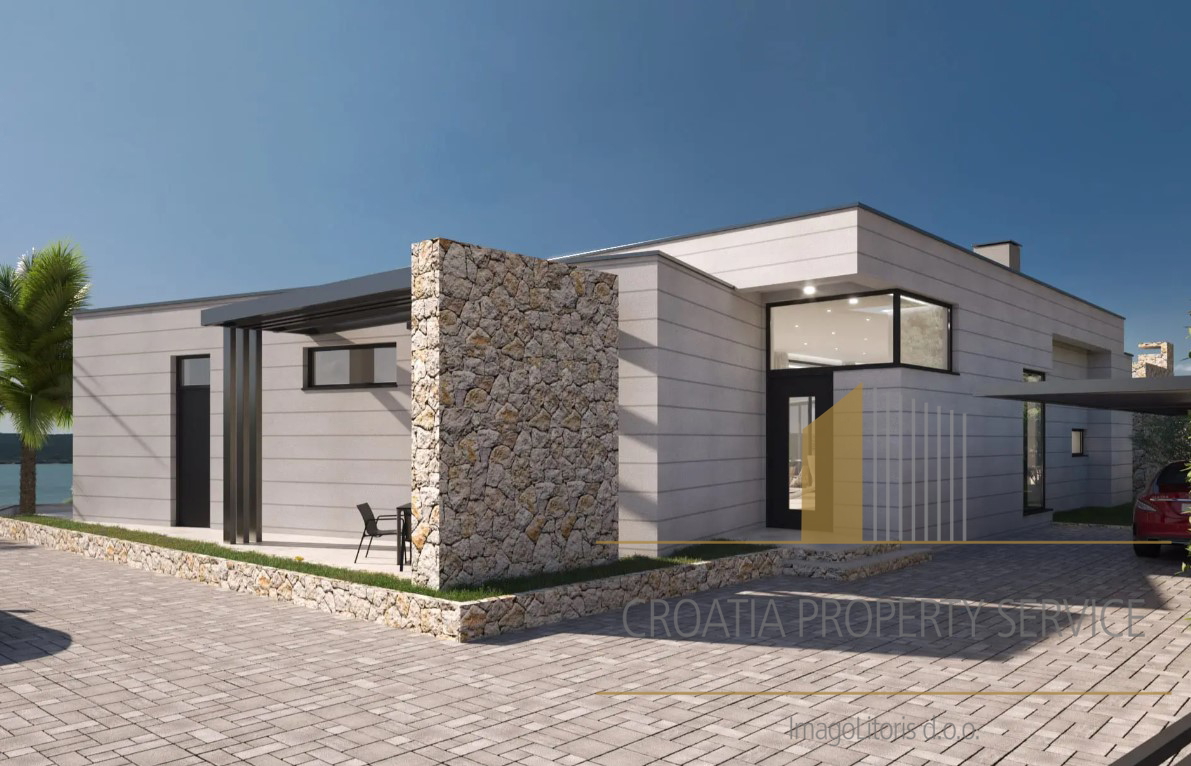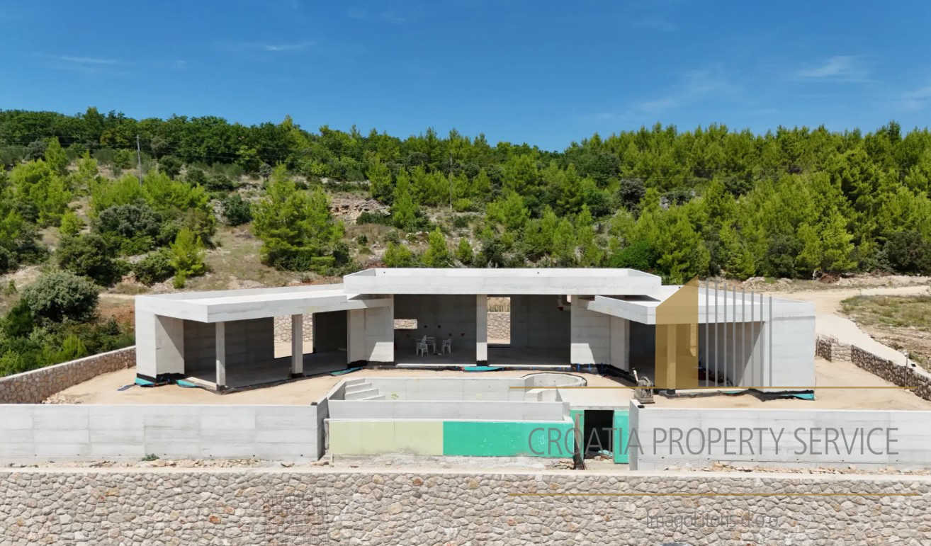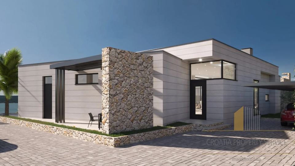 The villa is part of a complex with three villas, each providing an unobstructed view of the Adriatic Sea's blue waters.