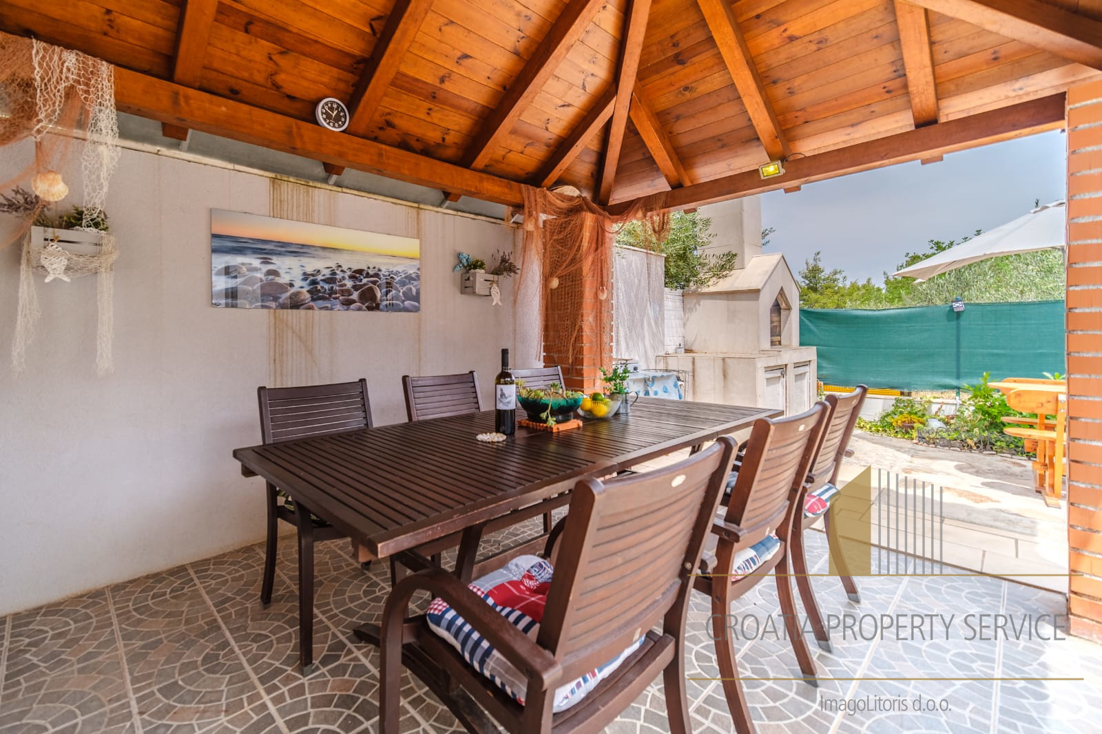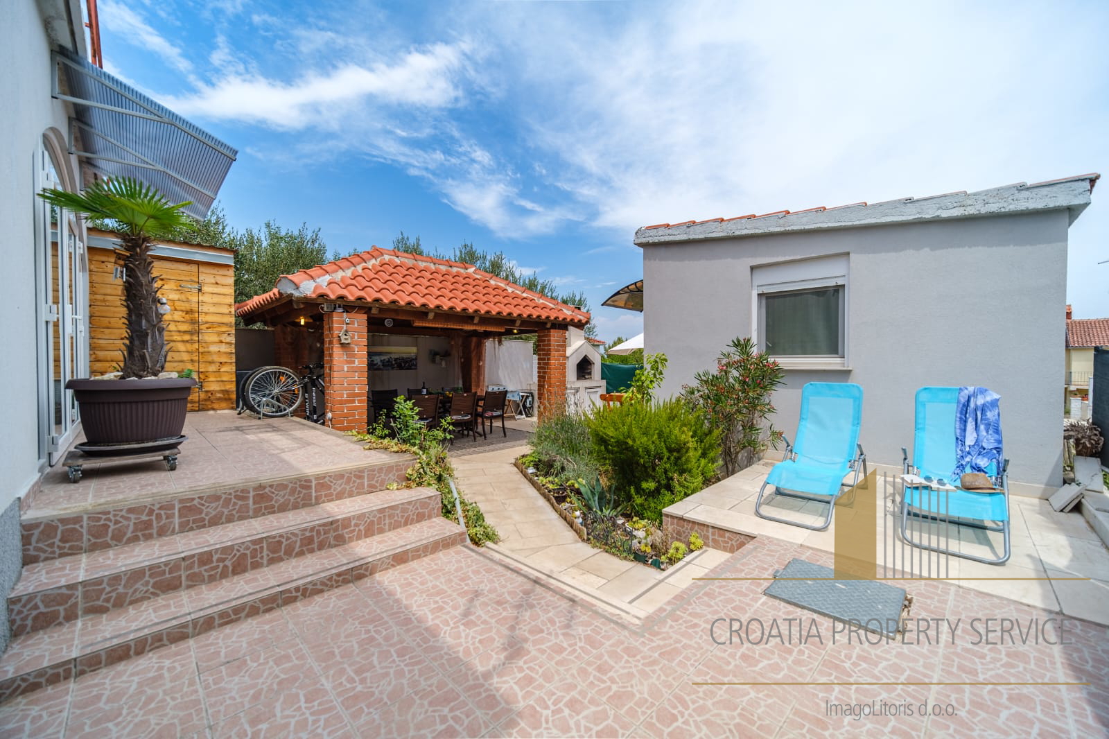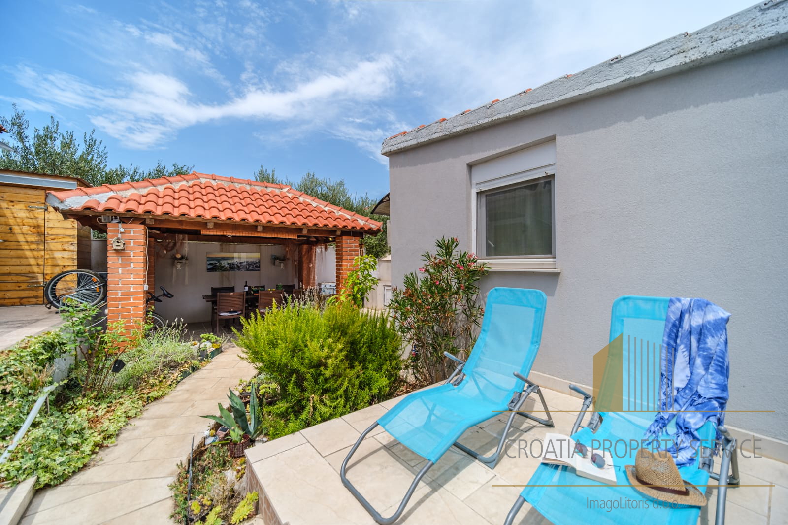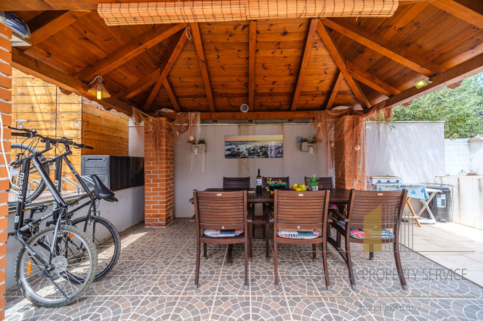 The yard is landscaped and equipped with a gazebo and a barbecue, ideal for relaxation and outdoor gatherings.
