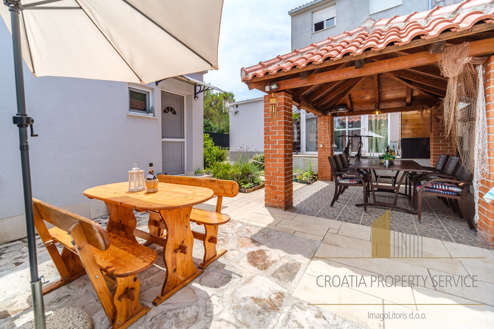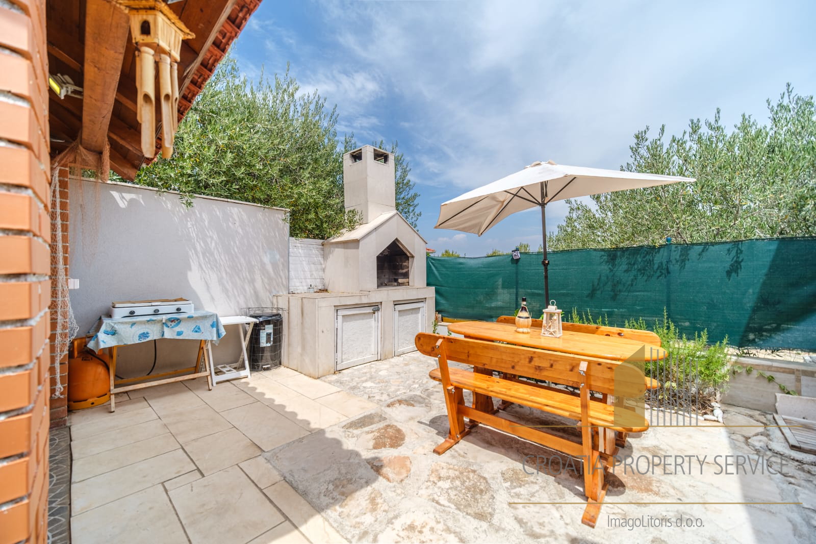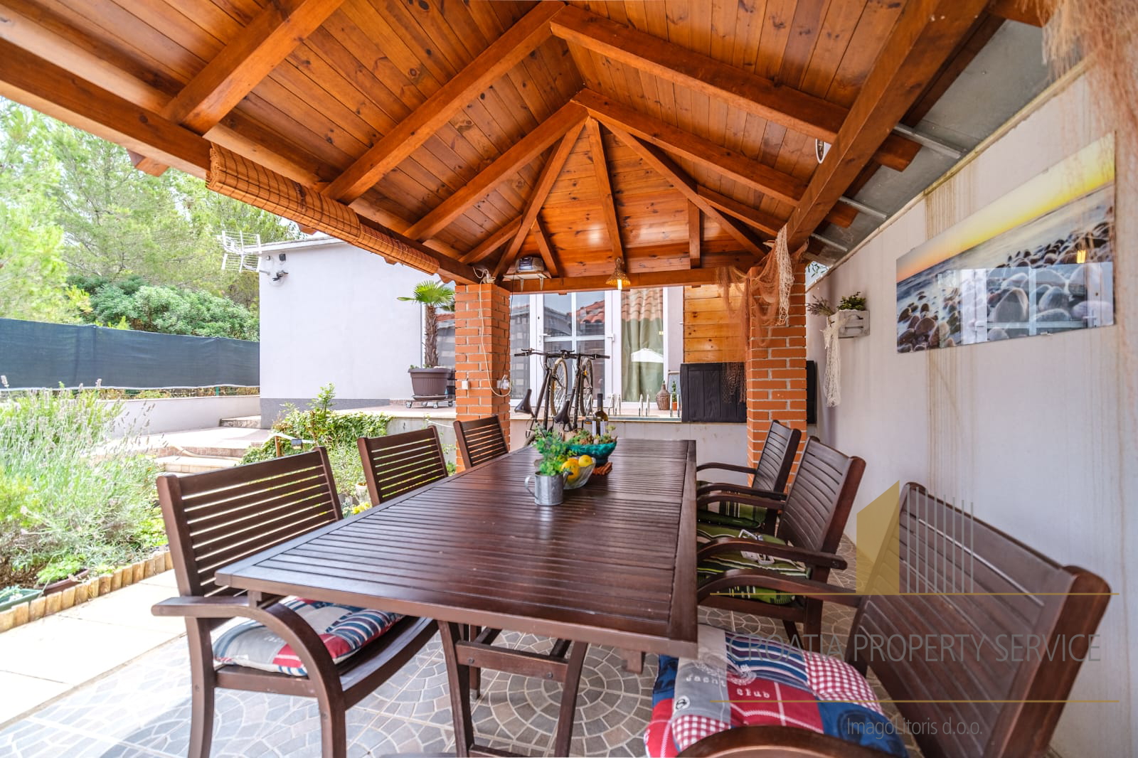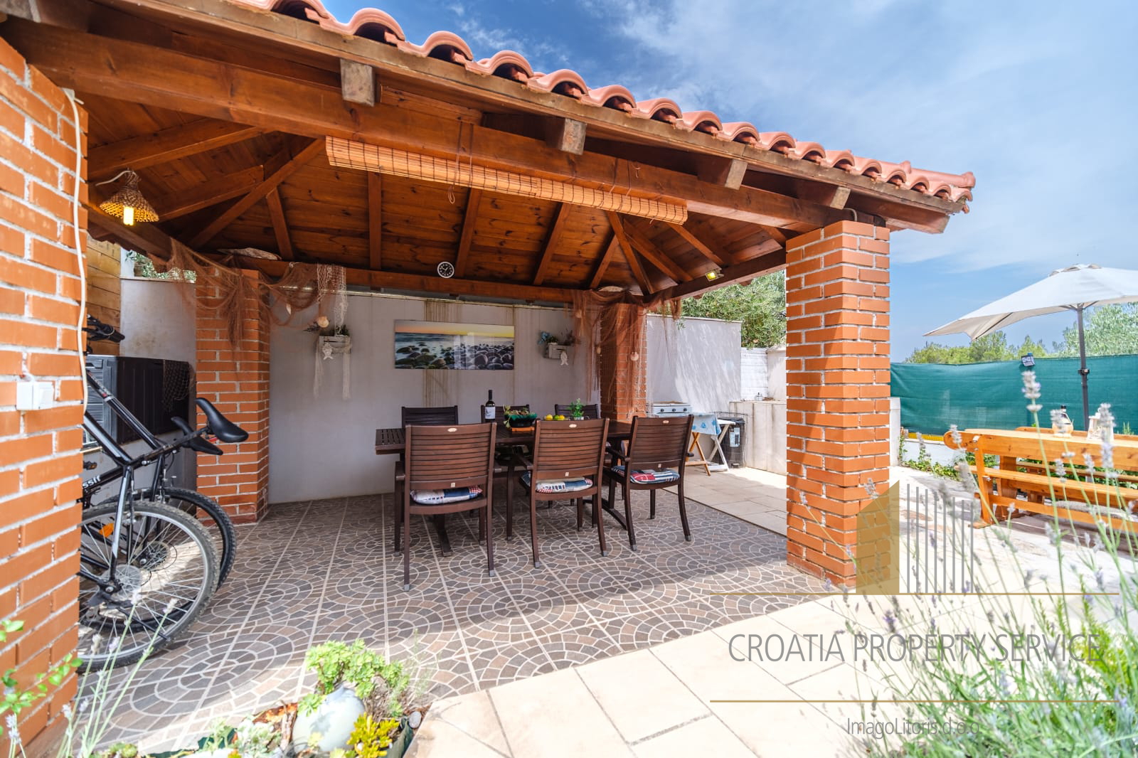 The yard is landscaped and equipped with a gazebo and a barbecue, ideal for relaxation and outdoor gatherings.