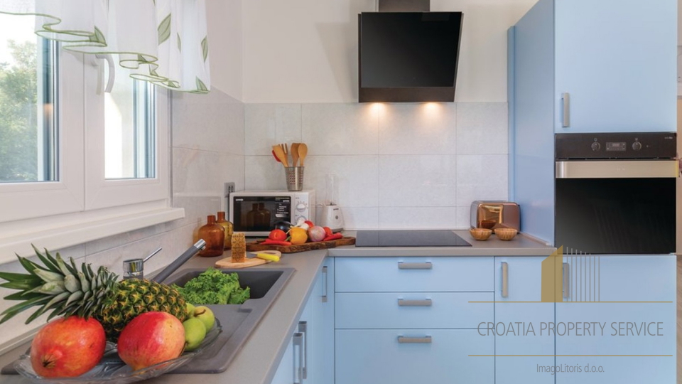 Sastoji se od prostranog dnevnog boravka i kuhinje, kupaonice, hodnika, dvije spavaće sobe. Jedna soba ima vlastitu kupaonicu. Iz kuhinje se izlazi na veliku terasu.