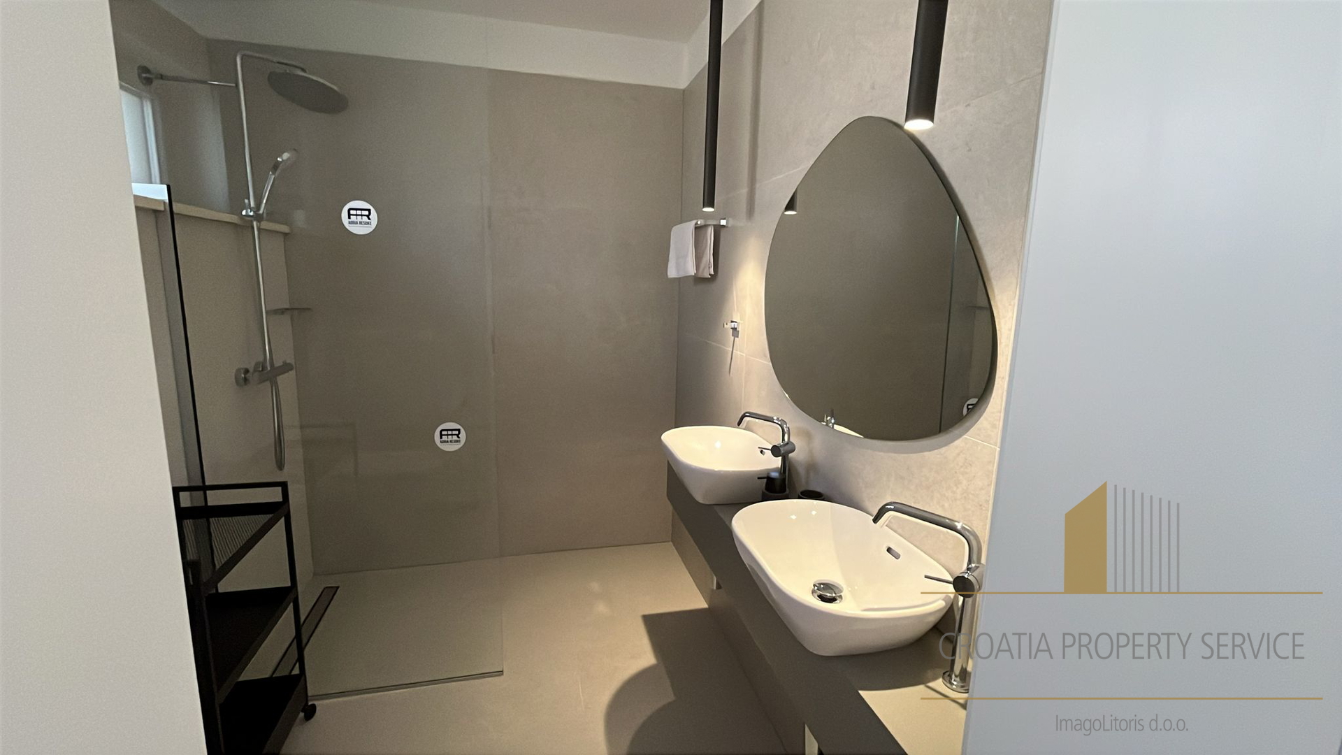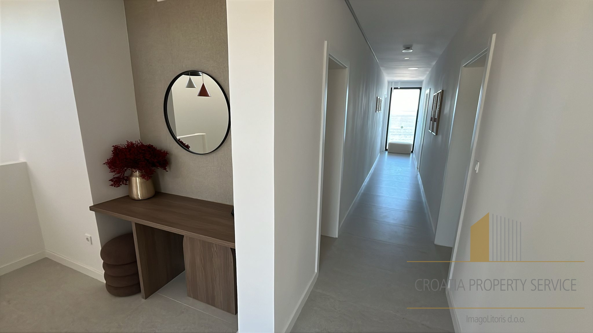 Na katu se nalaze tri elegantne spavaće sobe, svaka s vlastitom kupaonicom. Dvije sobe imaju izlaz na privatnu terasu s pogledom na more, pružajući dodatnu dozu luksuza i intime. Na istoj etaži smještena je i garaža za jedno vozilo.