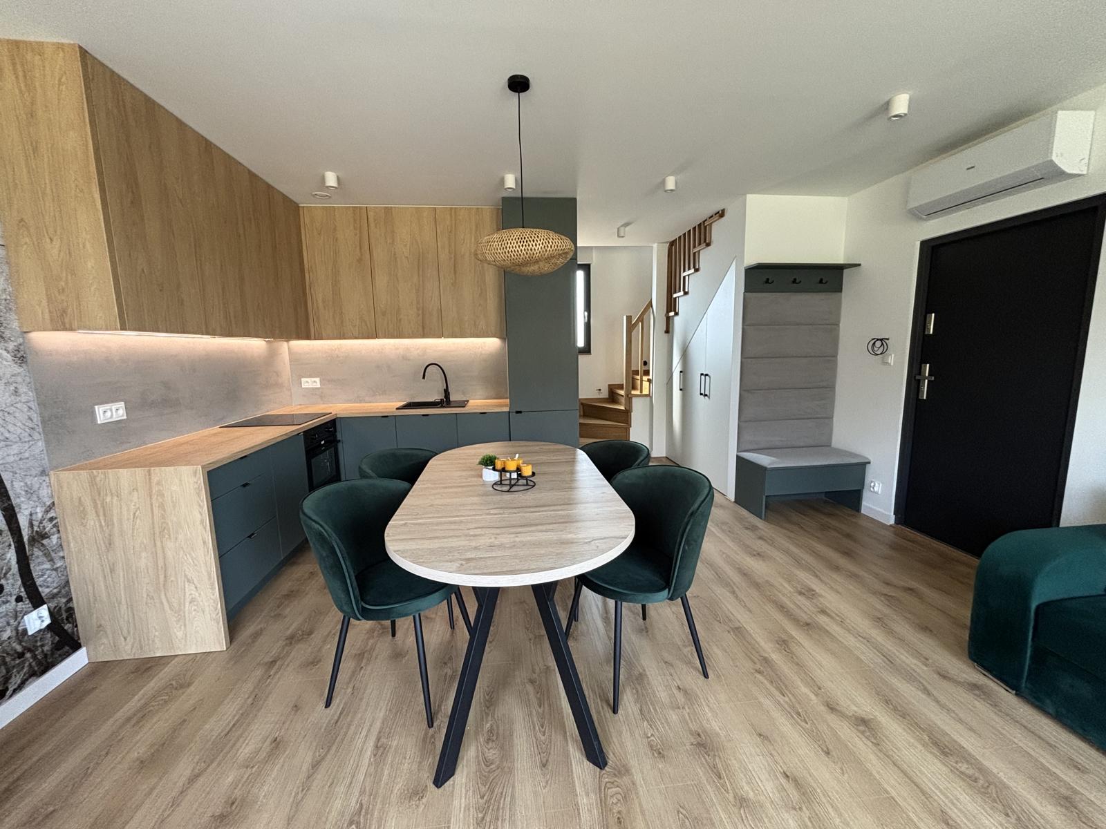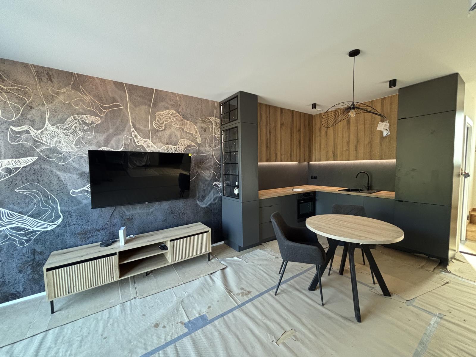 Prizemlje se sastoji od prostranog dnevnog boravka s kuhinjom, moderne kupaonice i terase okrenute prema istoku, dok kat nudi dvije udobne spavaće sobe i dodatnu kupaonicu s kadom.