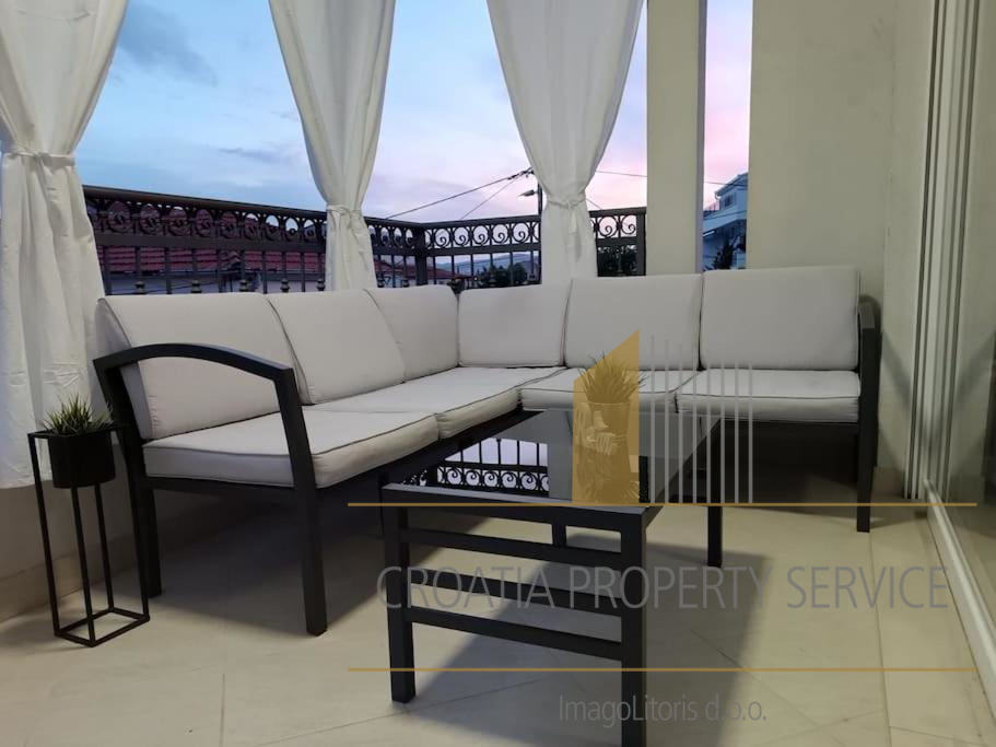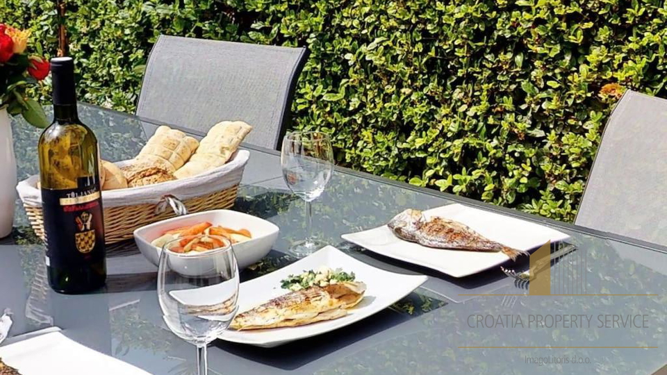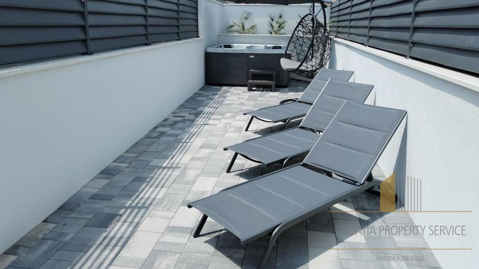 Vanjski prostor nudi terasu od 24 m2 i balkon od 12 m2, dok se na 220 m2 okućnice nalazi popločano dvorište s ugrađenim jacuzzijem, garažom i osiguranim parkirnim mjestima.