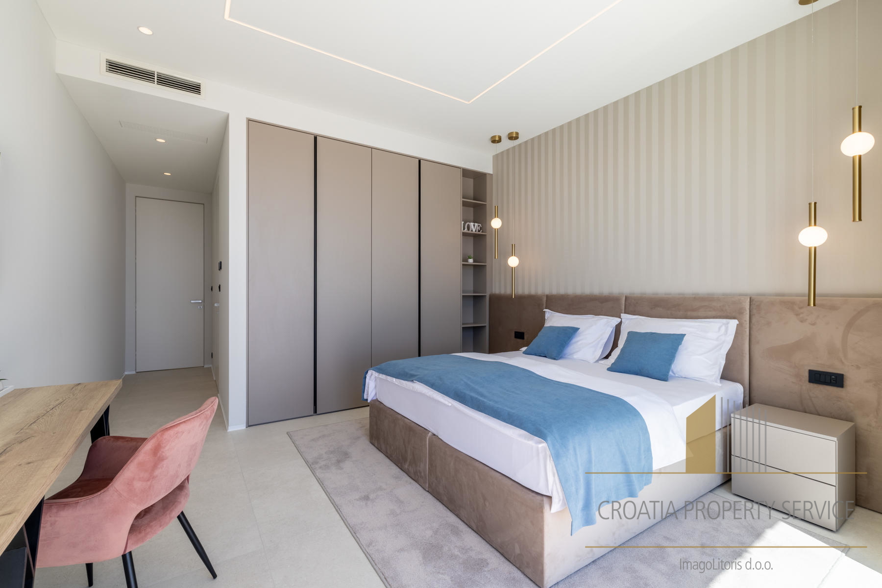 Interijer vile sastoji se od pet prostranih spavaćih soba, svaka s vlastitom en-suite kupaonicom, dodatnog toaleta za goste te elegantnog dnevnog boravka povezanog s moderno opremljenom kuhinjom i blagovaonicom otvorenog koncepta. Iz dnevne zone izlazi se na prostranu terasu idealnu za uživanje u mediteranskom načinu života, opremljenu luksuznim roštiljem, infinity bazenom, sunčalištem i jacuzzijem, sve s očaravajućim pogledom koji oduzima dah.