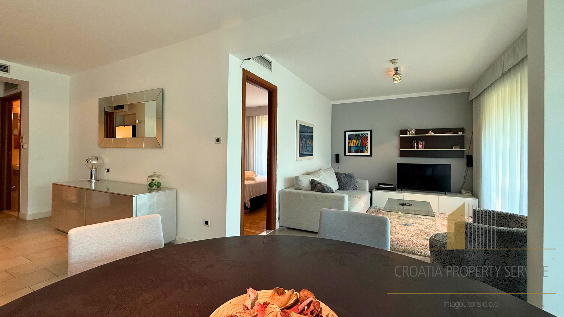 Elegantno uređen stan smješten unutar prestižnog turističkog naselja u neposrednoj blizini Splita, na samo 50 metara od kristalno čistog mora i prekrasne plaže.