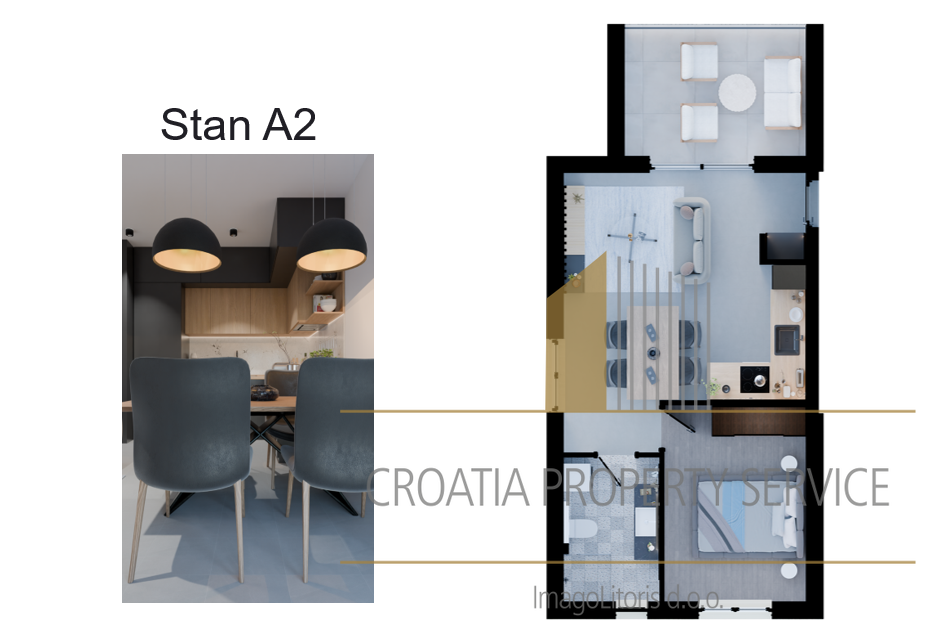 Stan A2 nalazi se na drugom katu i ima ukupnu neto stambenu površinu od 43,41 m2.