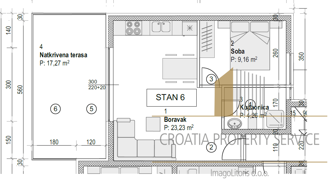 Stan S6 nalazi se na prvom katu moderne zgrade s ukupno 15 stambenih jedinica.
