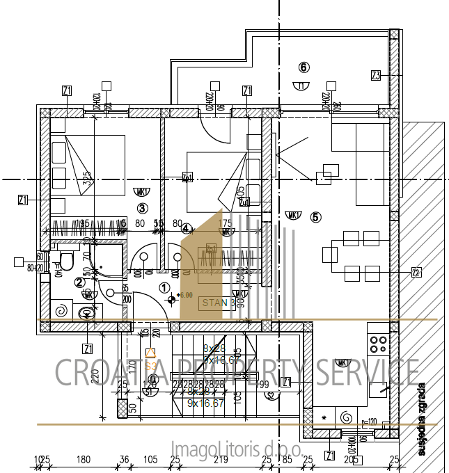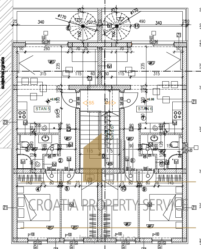 S5, drugi kat; 66.29 m2; dvije spavaće sobe, balkon, krovna terasa. Cijena: 320 000 €.