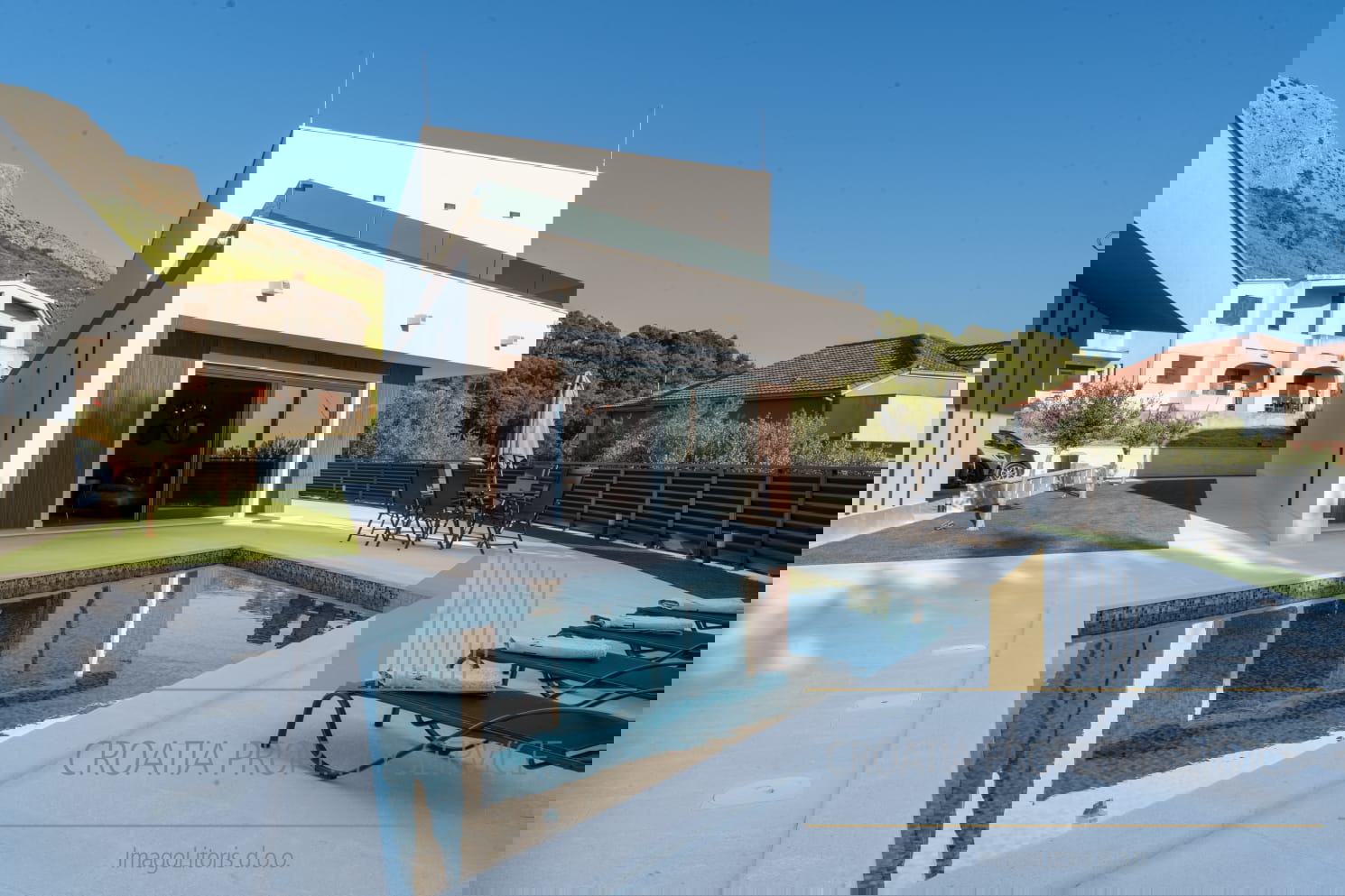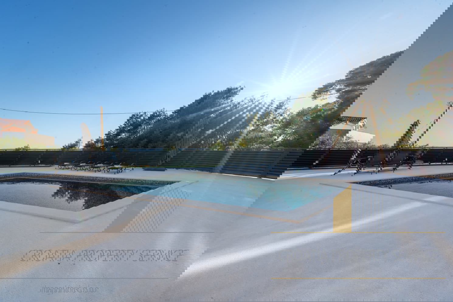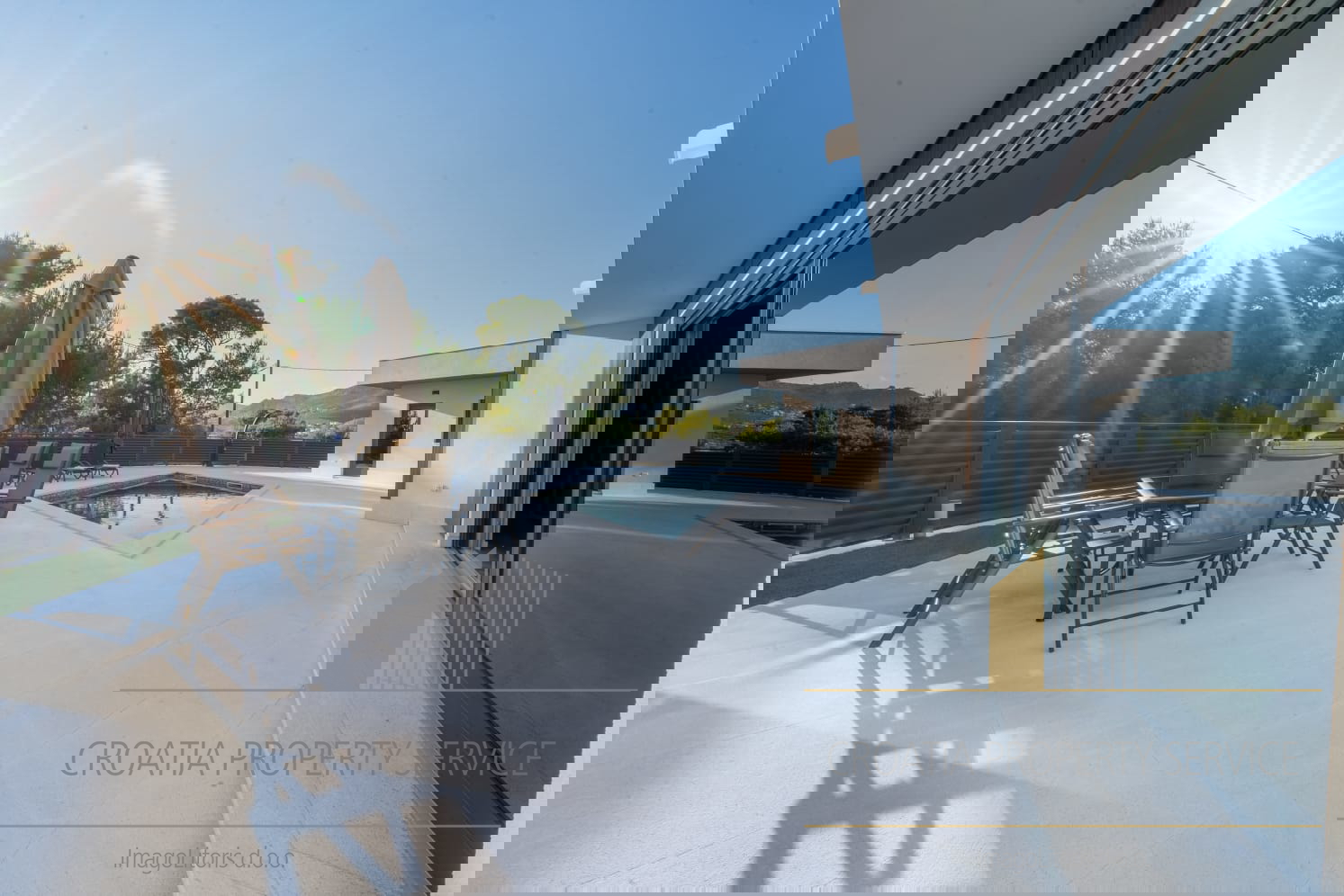 Na vanjskom dijelu posjeda nalazi se privatni bazen sa sunčanom terasom, savršeno mjesto za uživanje u mediteranskim danima, kao i vanjski prostor za objedovanje — idealan za večere pod zvjezdanim nebom.