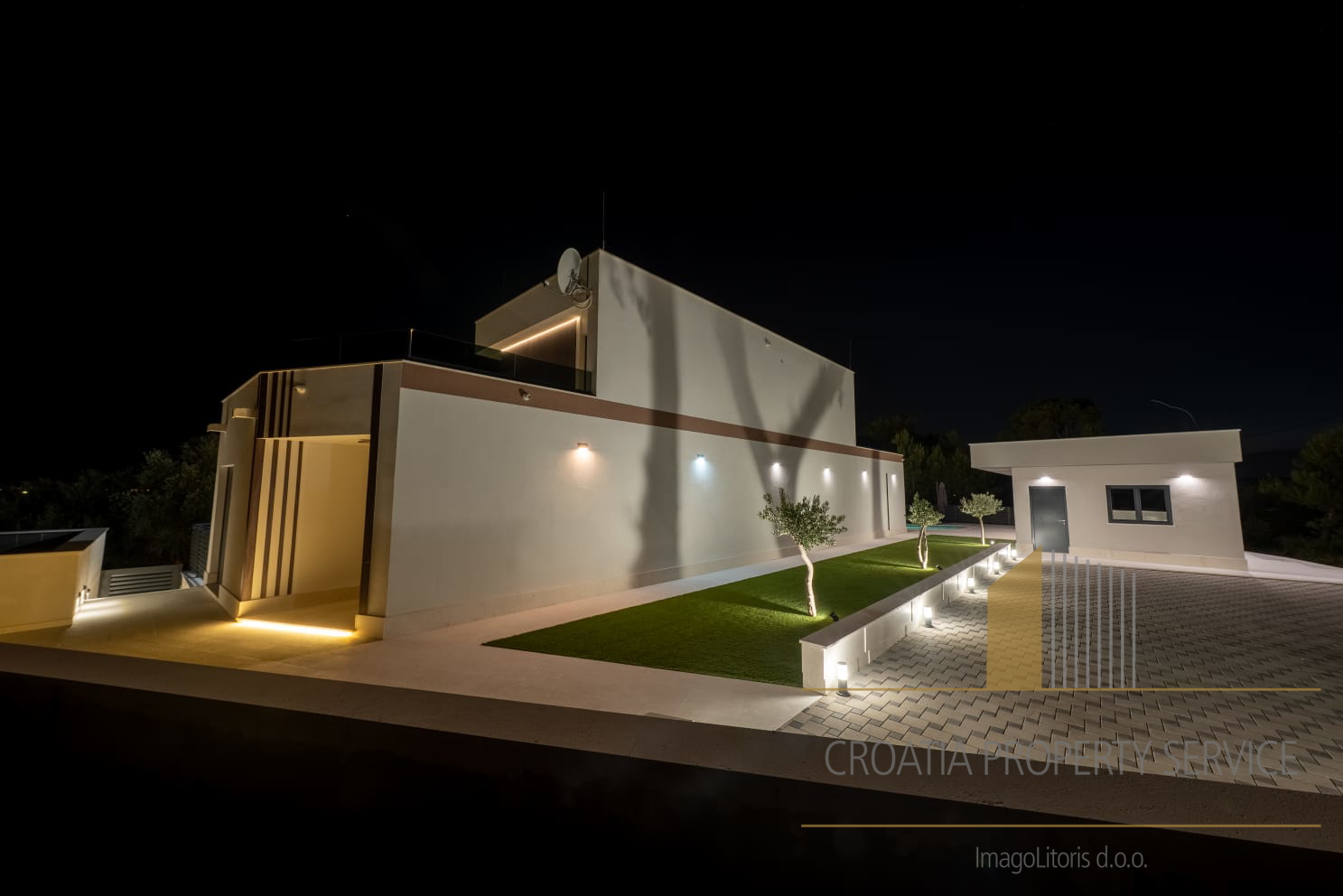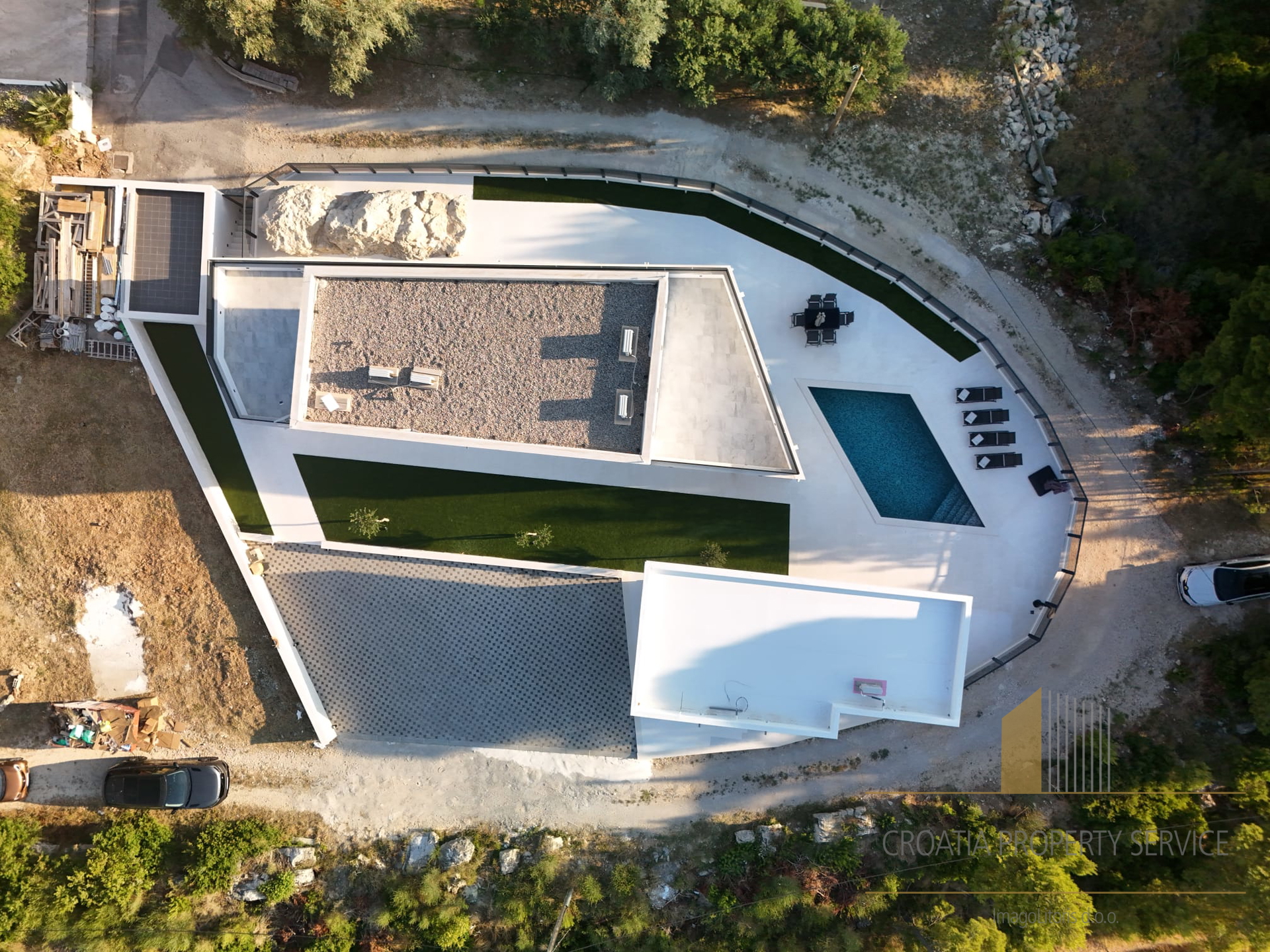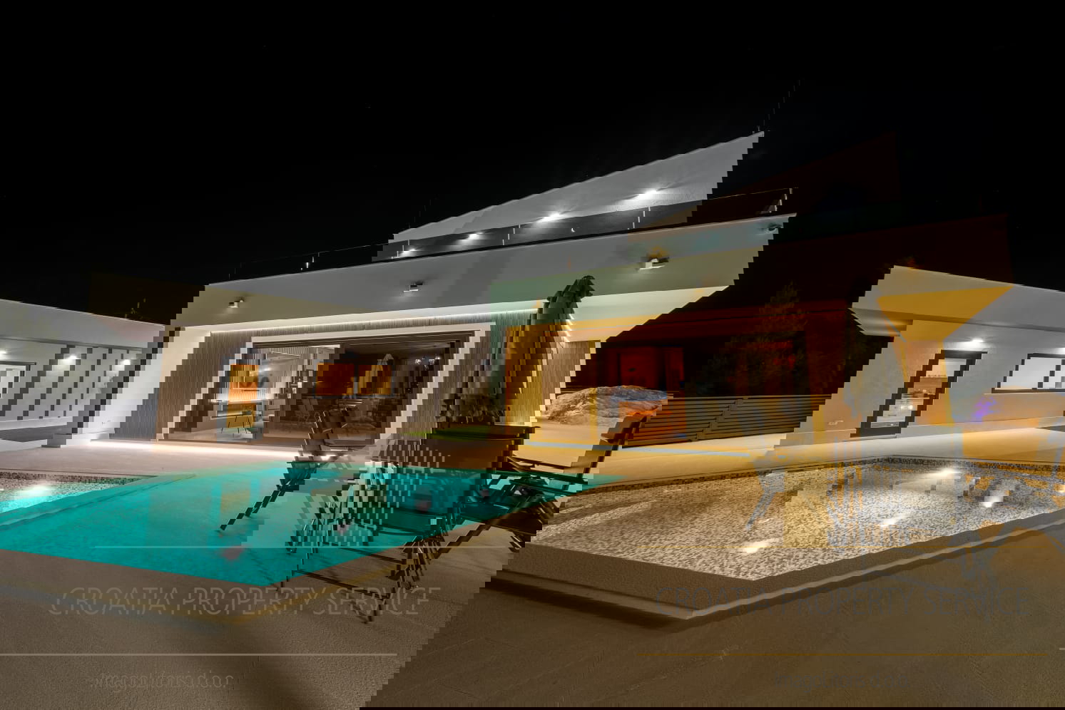 Na vanjskom dijelu posjeda nalazi se privatni bazen sa sunčanom terasom, savršeno mjesto za uživanje u mediteranskim danima, kao i vanjski prostor za objedovanje — idealan za večere pod zvjezdanim nebom.
