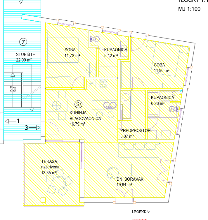 Stan se sastoji od: dvije spavaće sobe, od kojih jedna ima vlastitu kupaonicu, dodatne kupaonice, moderno opremljene kuhinje s blagovaonicom, prostranog dnevnog boravka s izlazom na terasu.