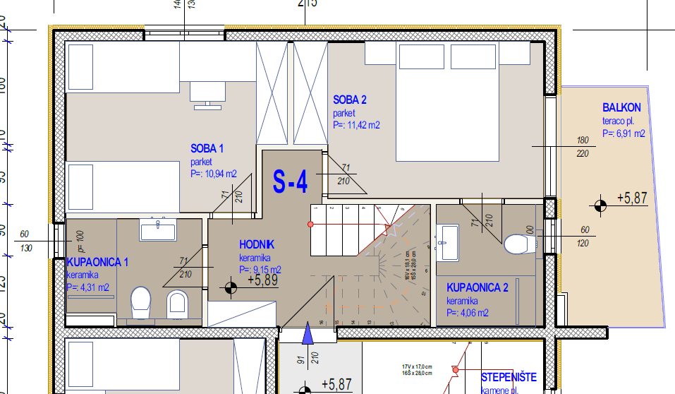 Dvoetažni stan površine 100 m2 nudi prostran i funkcionalan raspored: na donjoj etaži nalazi se ulazni hodnik, spavaća soba s vlastitom kupaonicom i balkonom, dodatna spavaća soba te još jedna kupaonica. Gornja etaža otvorenog koncepta obuhvaća kuhinju s blagovaonicom i dnevni boravak, WC te izlaz na prostranu terasu, savršenu za uživanje u pogledu i sunčanim danima.