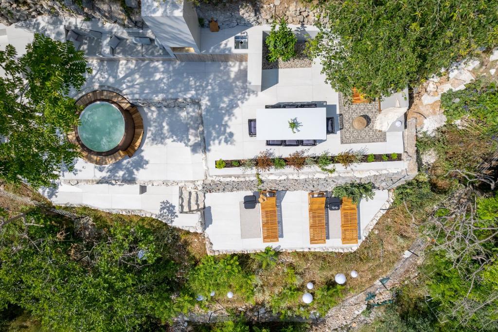 Na raspolaganju je i zajednički, pažljivo uređen vrt koji uključuje potpuno opremljenu vanjsku kuhinju, jacuzzi, finsku saunu s pogledom na more, vanjski tuš, pergolu s blagovaonicom, lounge zonu za opuštanje te prostor za vježbanje.