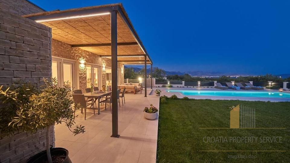 Splendida nuova villa situata in una posizione eccellente a Kaštela, offre la perfetta combinazione di privacy e lusso. Si trova in una zona verde, dove non è consentita ulteriore edificazione, garantendo tranquillità e riservatezza. La villa è idealmente posizionata tra Spalato e Trogir, a soli 1,5 km dal mare e dalle spiagge, e vicino a tutti i servizi.