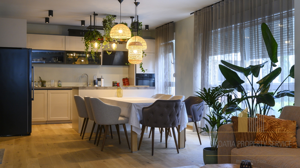 Situato al secondo piano di un edificio residenziale di recente costruzione, l'appartamento di 86 m2 di superficie interna affascina con una disposizione moderna e spazi ampi: due camere da letto, due eleganti bagni, una cucina luminosa con zona pranzo e soggiorno, e una loggia chiusa di 14 m2 che offre uno spazio perfetto per il relax.