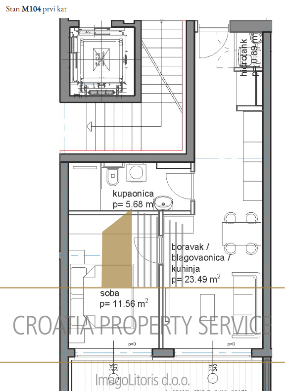 L’appartamento M104 si trova al primo piano di uno degli edifici. La superficie abitabile dell’appartamento è di 58,29 m2.