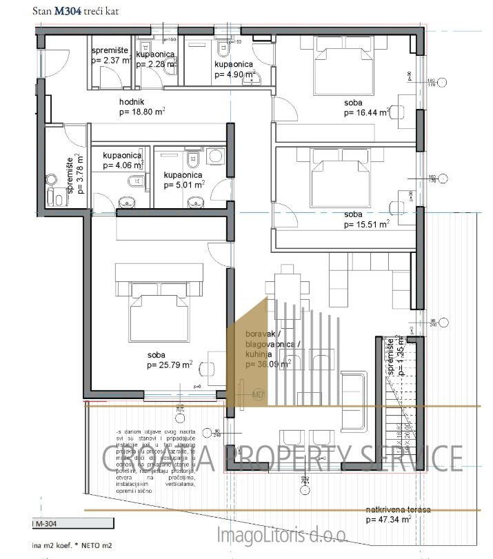 M304, attico: 209,96 m2; 3 camere da letto, terrazza coperta, terrazza sul tetto. Prezzo: 1.679.680,00 €
