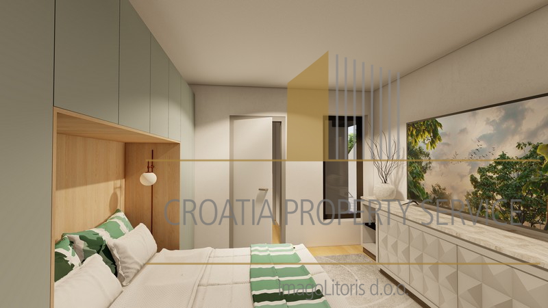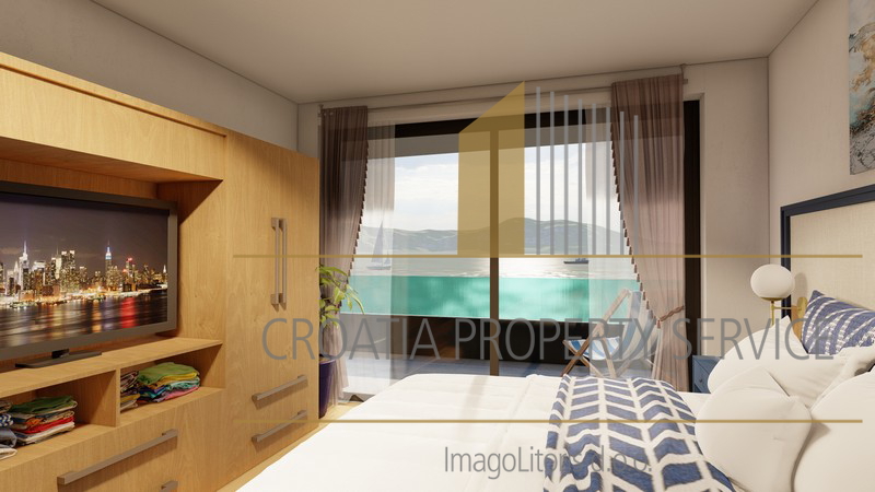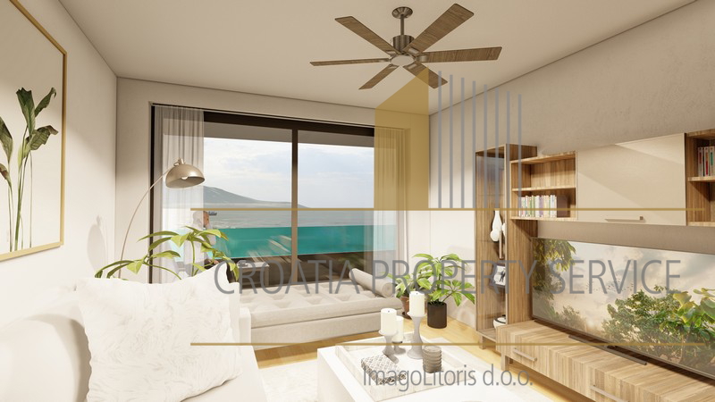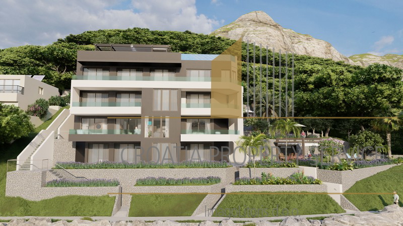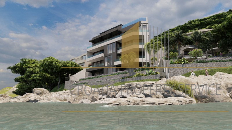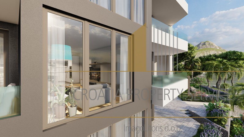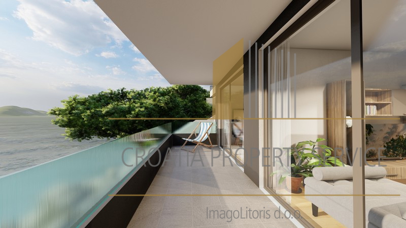 In offerta un esclusivo appartamento bilocale in un nuovo edificio di lusso con piscina, situato in prima fila sul mare in una delle località più ricercate della Dalmazia.