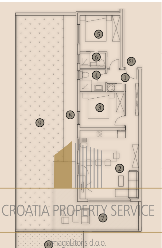 Nello stesso edificio è in vendita anche il Penthouse S5, situato al secondo piano, con una superficie netta di 84 m2 e un'ampia terrazza sul tetto con vista aperta sul mare. Il penthouse è composto da cucina con zona pranzo e soggiorno, due camere da letto, due bagni e terrazza coperta. Nel prezzo è incluso un posto auto in garage, mentre il prezzo del penthouse è di 440.000 €.