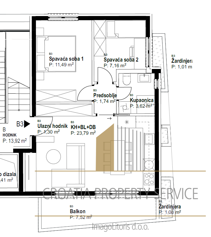 L'appartamento B3 si trova al primo piano dell'edificio sud, con una superficie abitabile totale di 51 m2. Una pianta ben progettata offre la combinazione perfetta di comfort e vita moderna.
