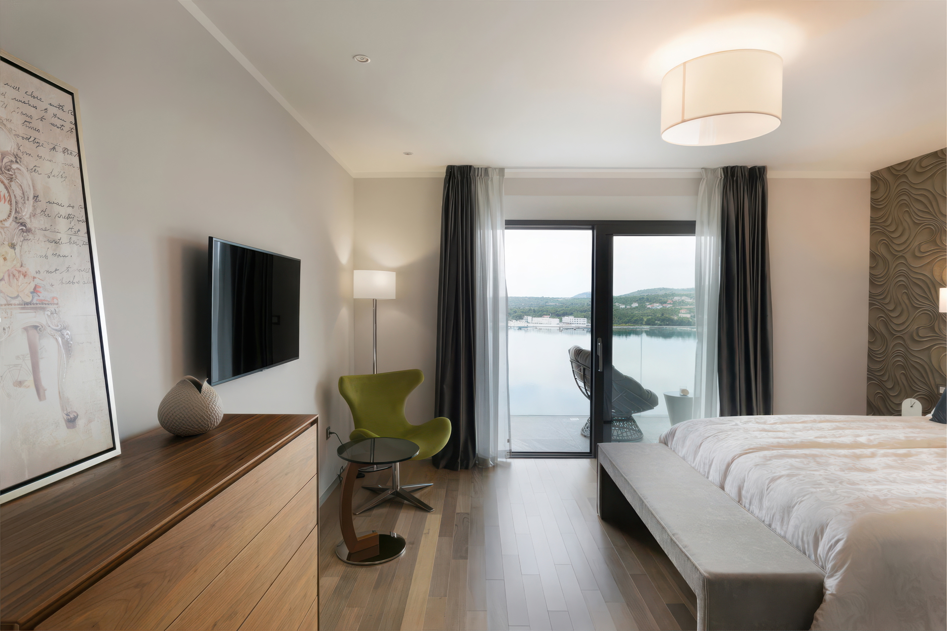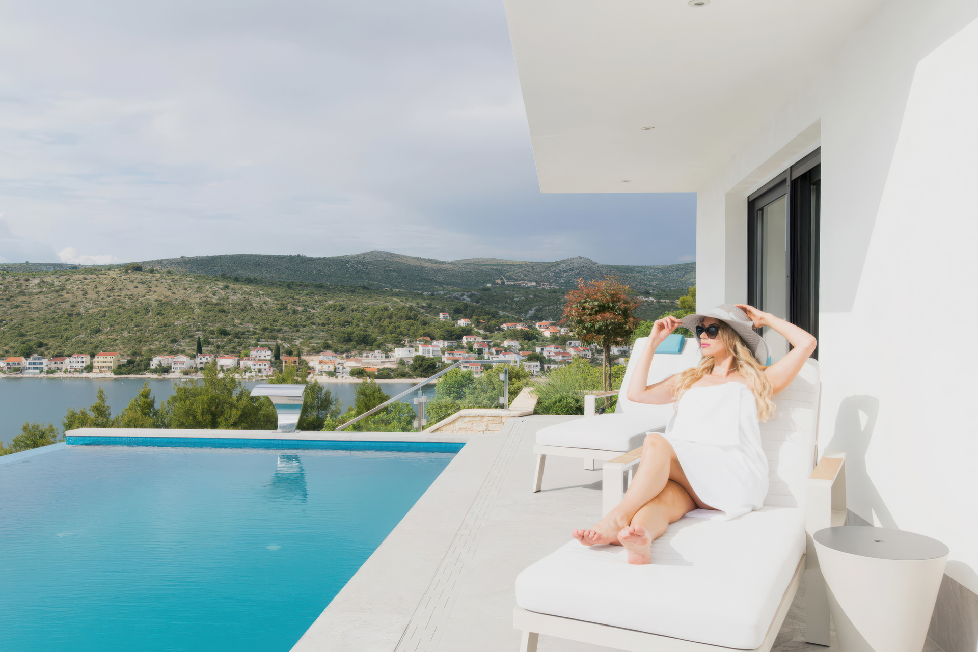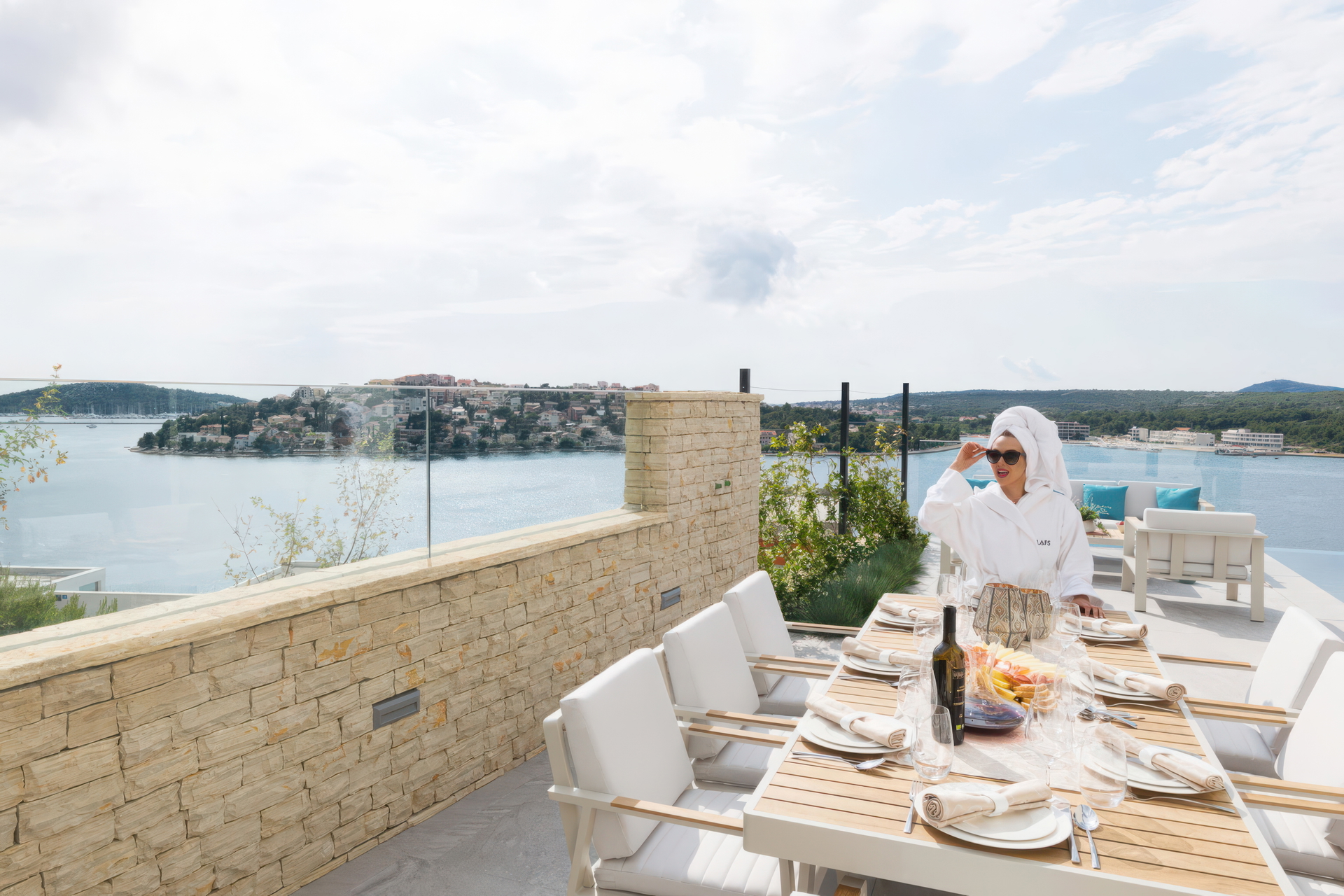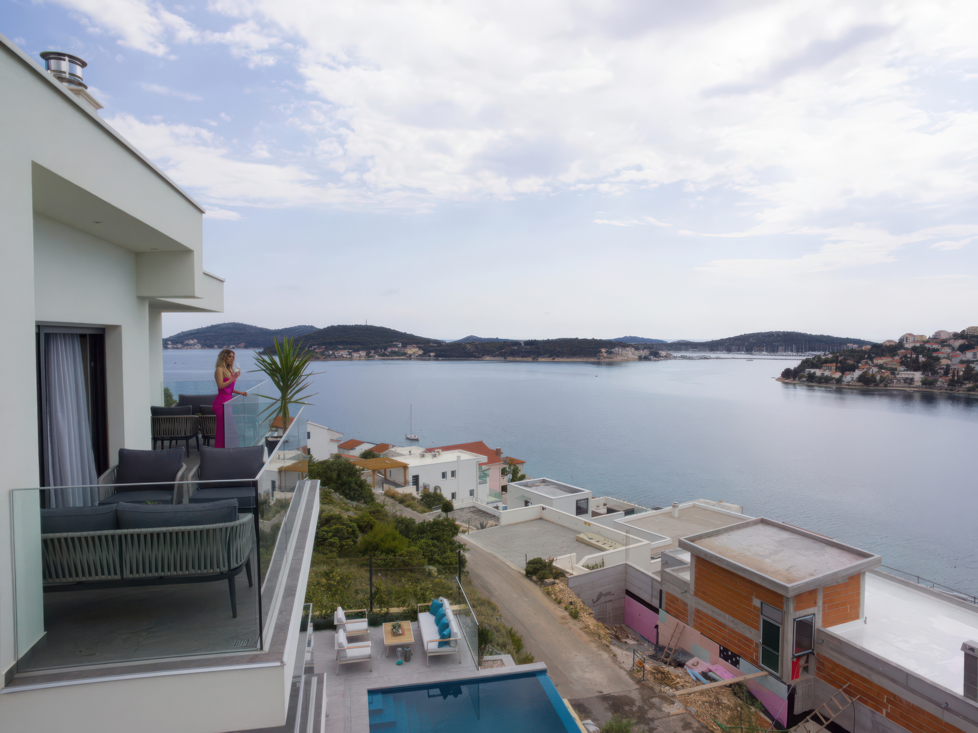 Вилла находится всего в 50 м от моря на пологом склоне, что обеспечивает беспрепятственный панорамный вид на Адриатическое море и окружающие острова практически с каждого этажа, создавая идеальный оазис для отдыха и наслаждения.
