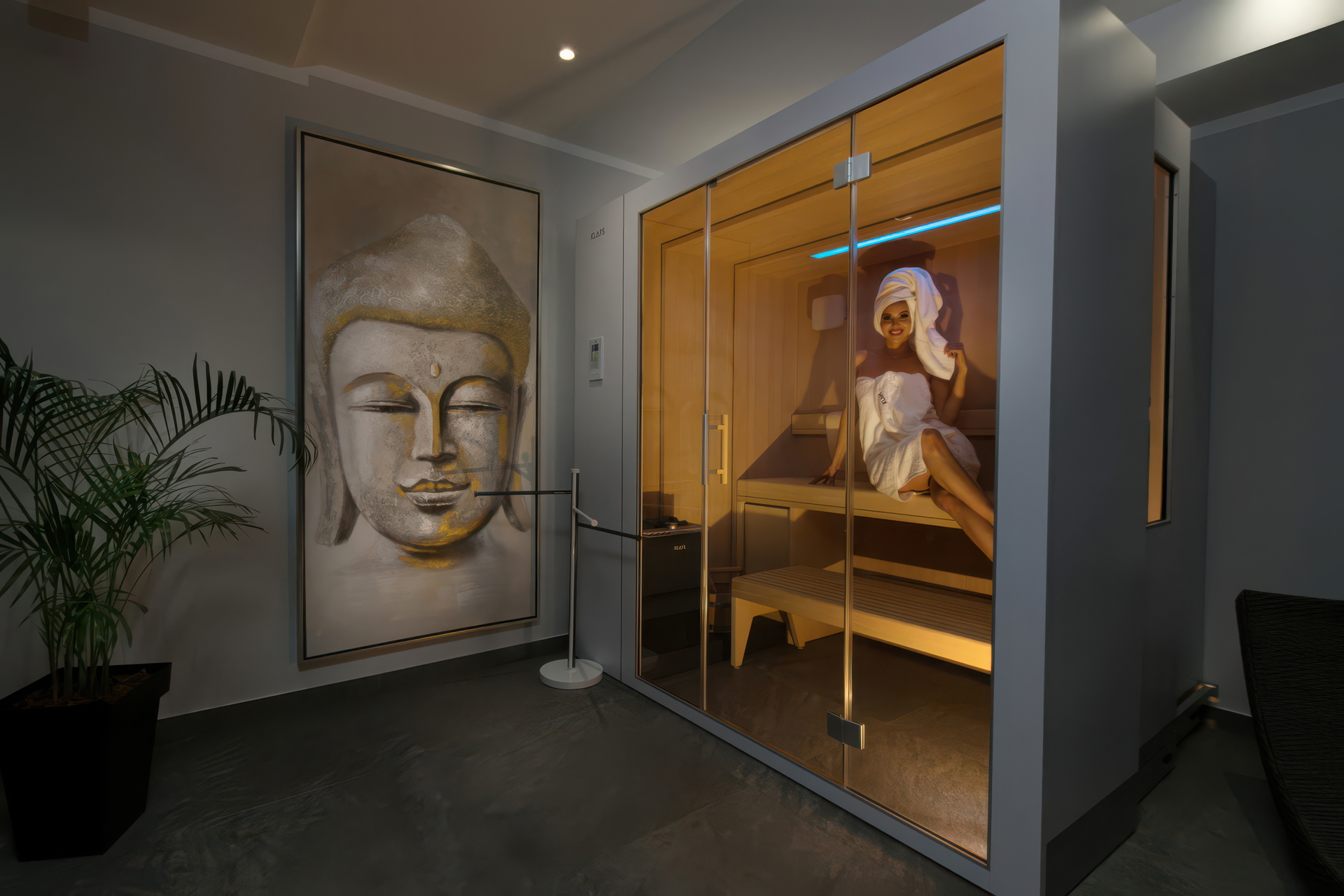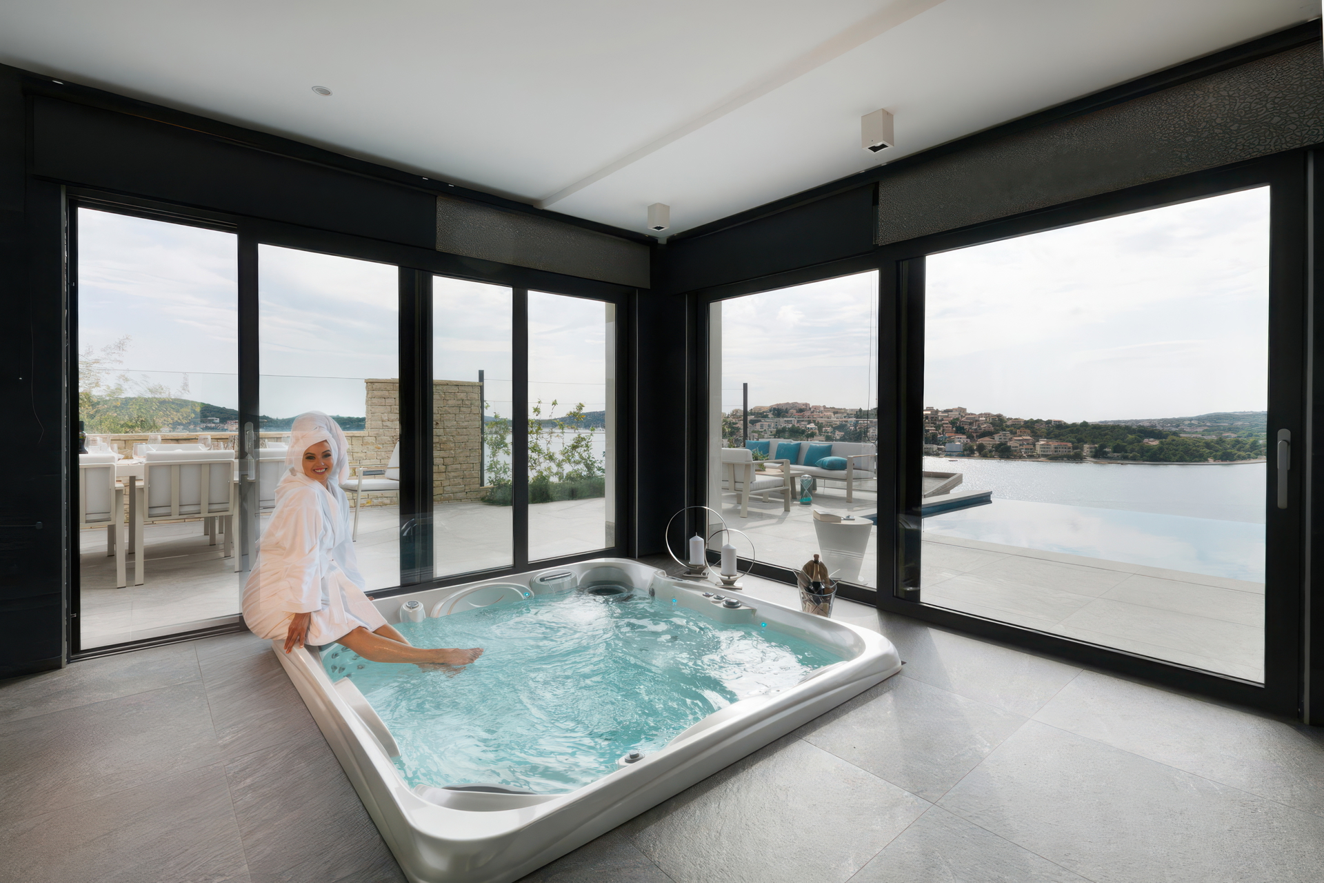 В цокольном этаже расположена эксклюзивная зона велнес с джакузи, домашним тренажёрным залом и гидравлической сауной, а также вспомогательными помещениями, такими как ванная комната, прачечная, кладовая и котельная. Большие раздвижные стеклянные двери соединяют внутреннее пространство с наружным бассейном — идеальным местом для наслаждения восхитительными закатами.