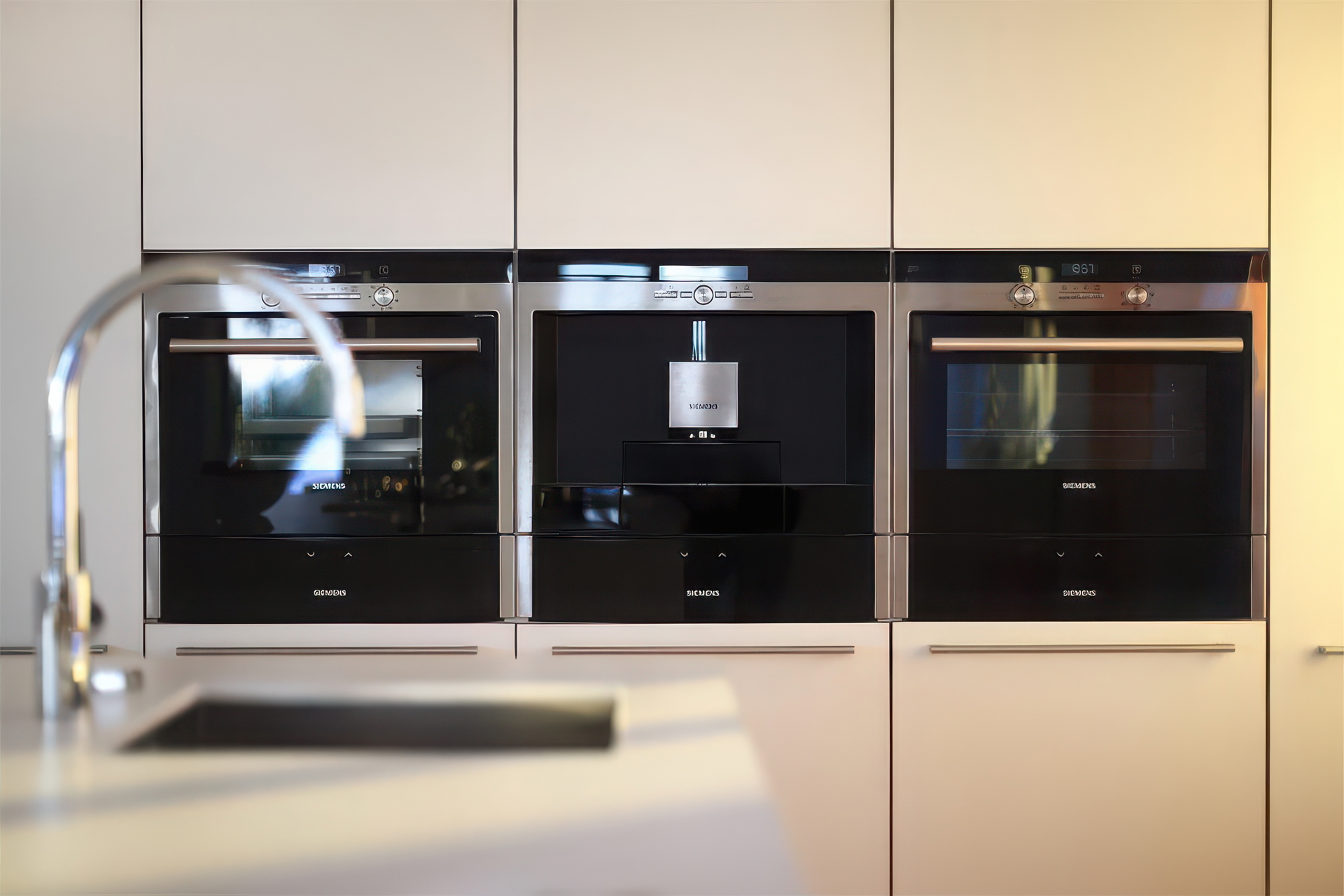 На первом этаже расположен просторный гостиной с элегантным камином Invicta, идеальным для уютных встреч, а также современная кухня открытой планировки с обеденной зоной, оснащённая высококлассной техникой Siemens. На этом же этаже находятся гостевой туалет, прачечная и подсобное помещение.
