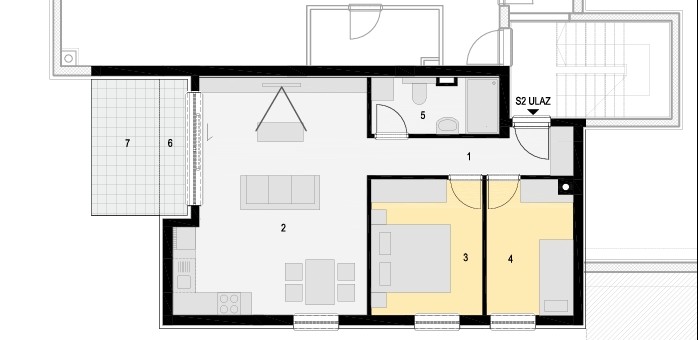 S6, второй этаж: 48,84 м2, 1 спальня, лоджия, терраса. Цена: 288 156 €.