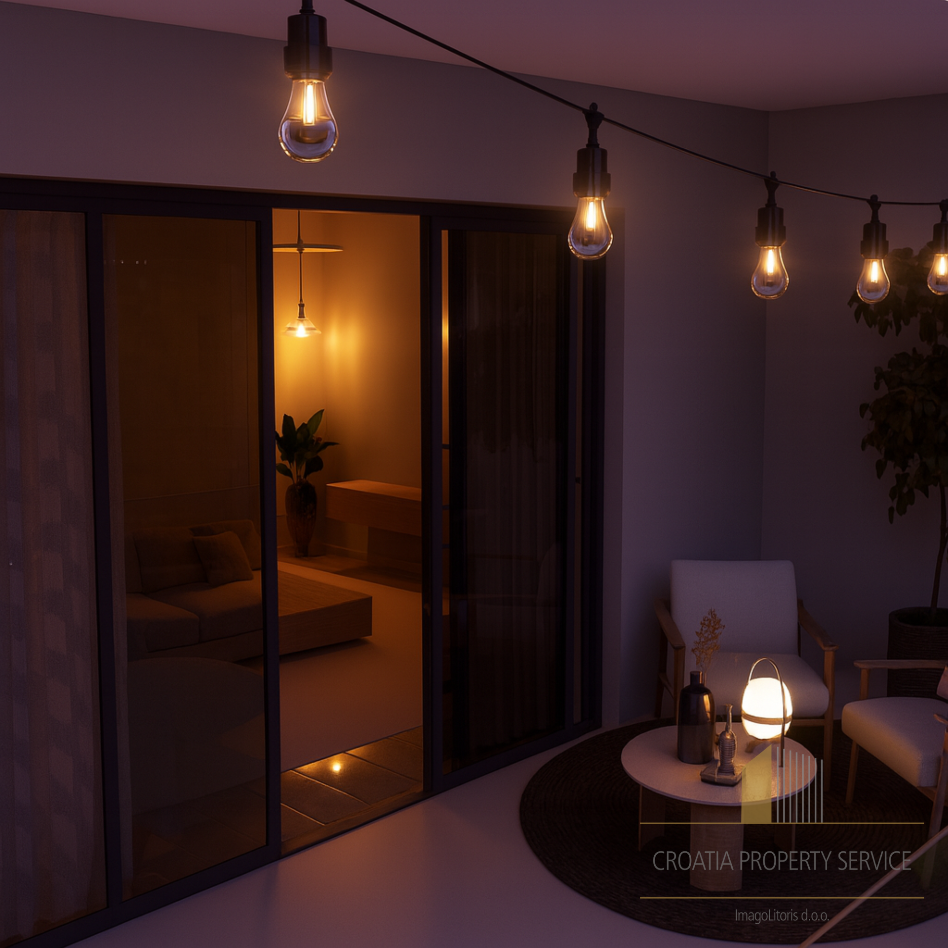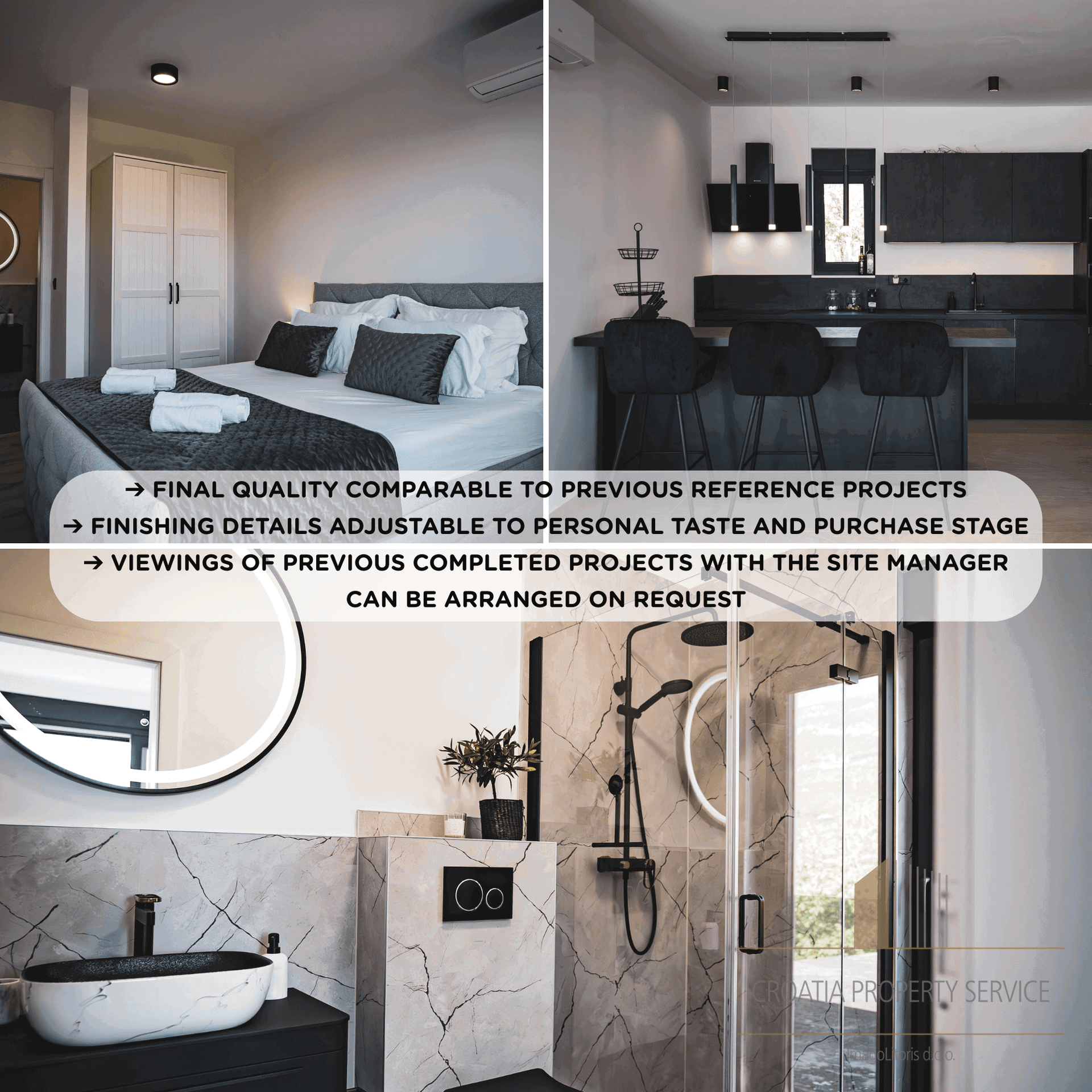 To elegantno stanovanje z delnim pogledom na morje se odlikuje po svetlem in zračnem notranjosti, sodobnem oblikovanju in vrhunski kakovosti gradnje.
