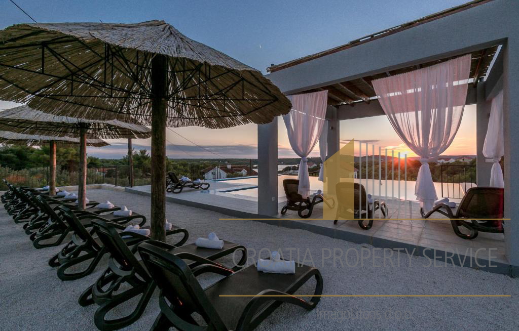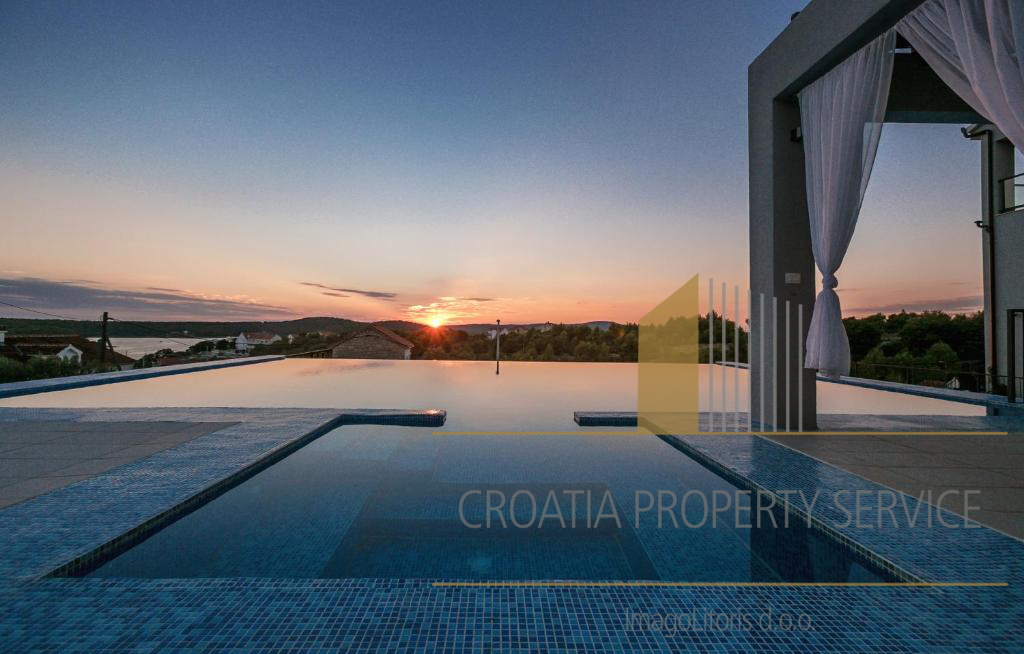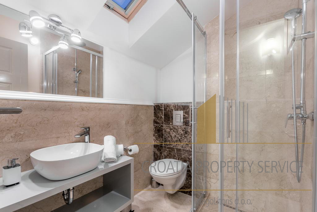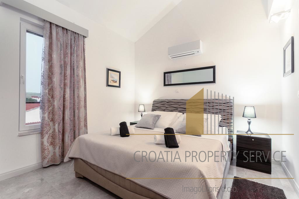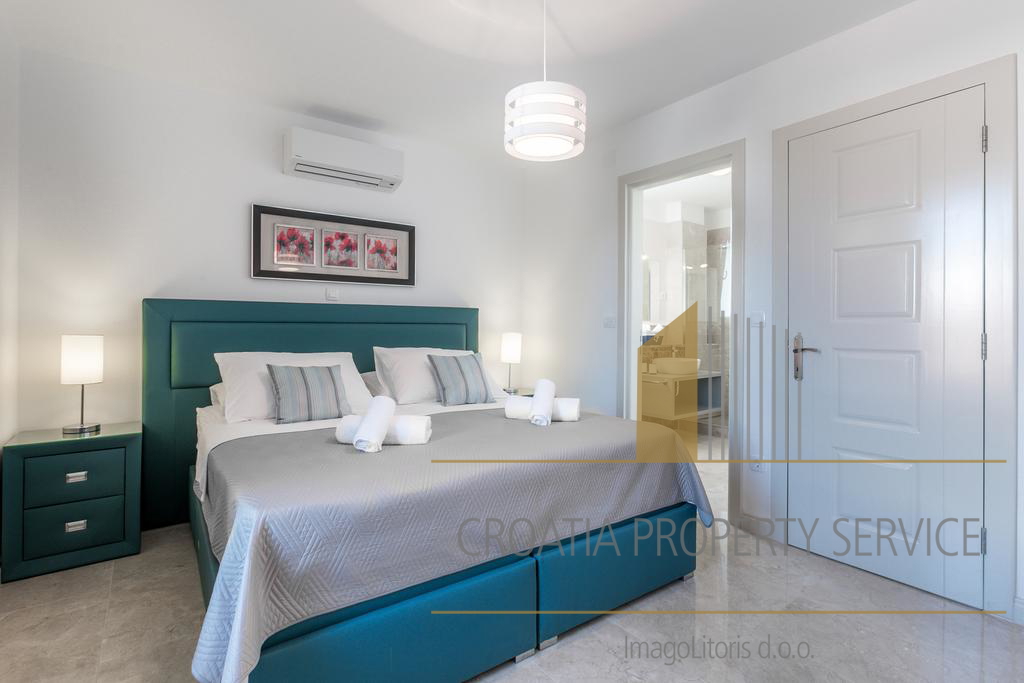 Notranje stopnice vodijo v prvo nadstropje, kjer sta dve spalni sobi, vsaka z lastno luksuzno kopalnico, medtem ko je v drugem nadstropju še ena elegantna spalnica z lastno kopalnico ter dodatni dnevni prostor z izhodom na balkon, s katerega se odpira čudovit pogled na morje.