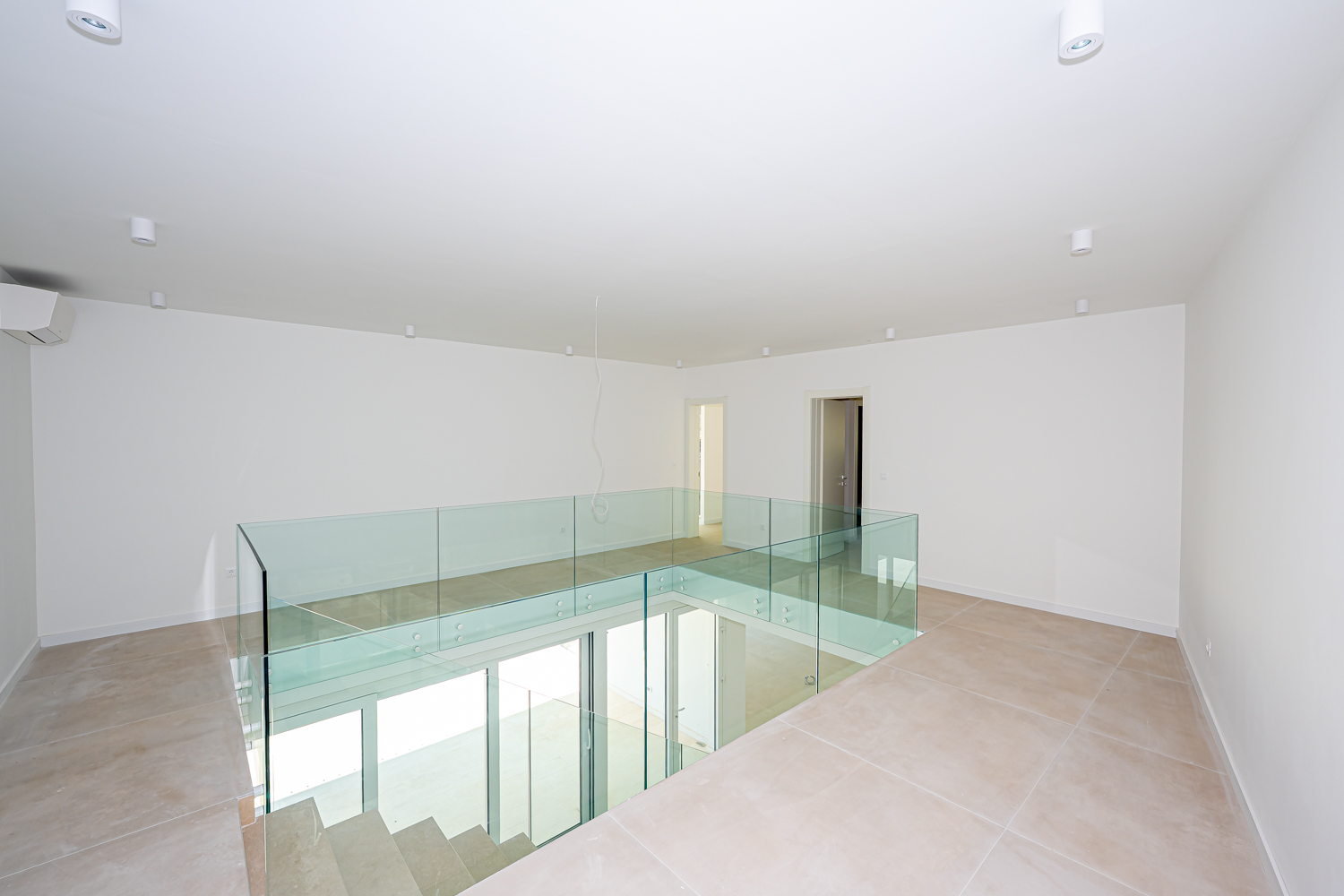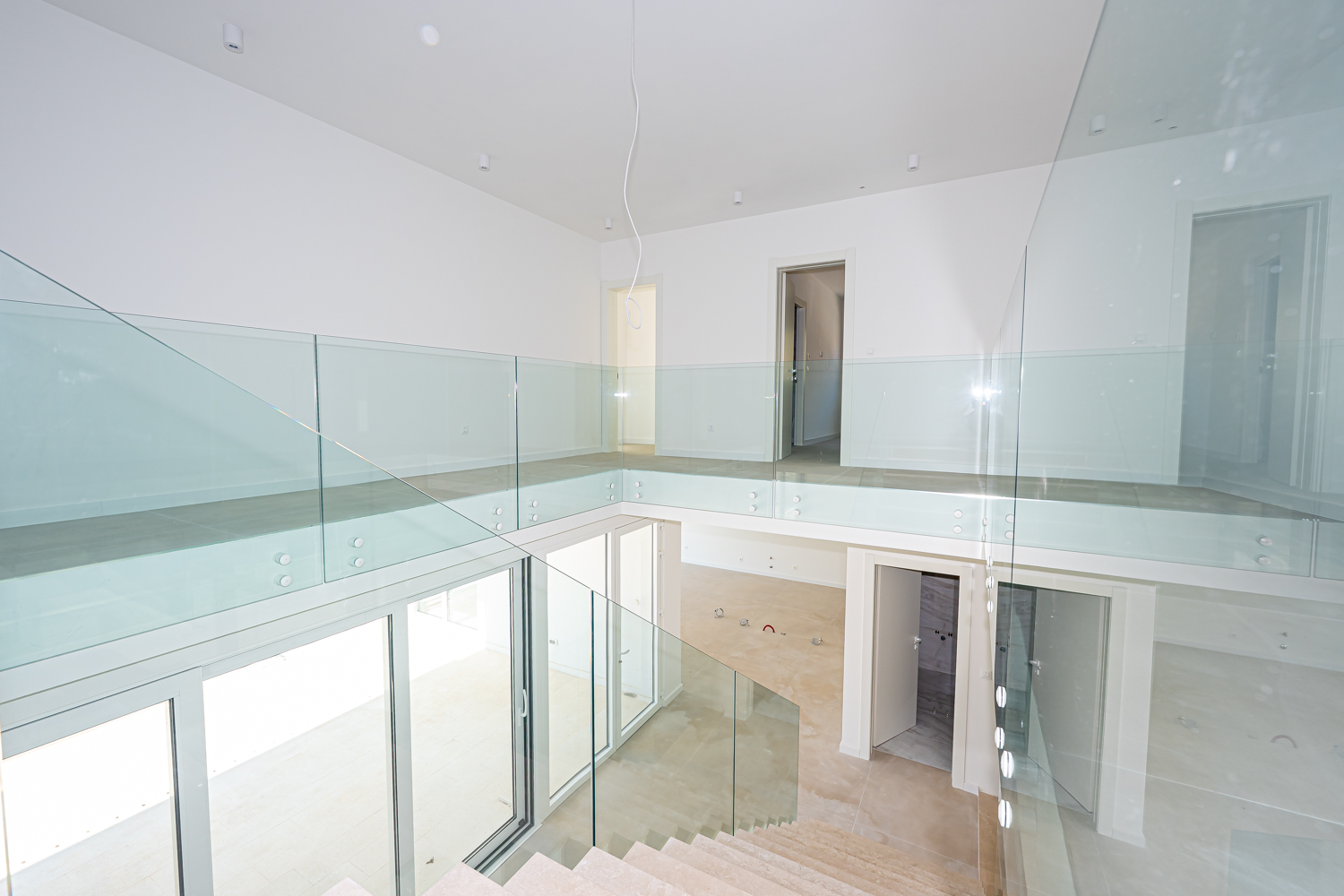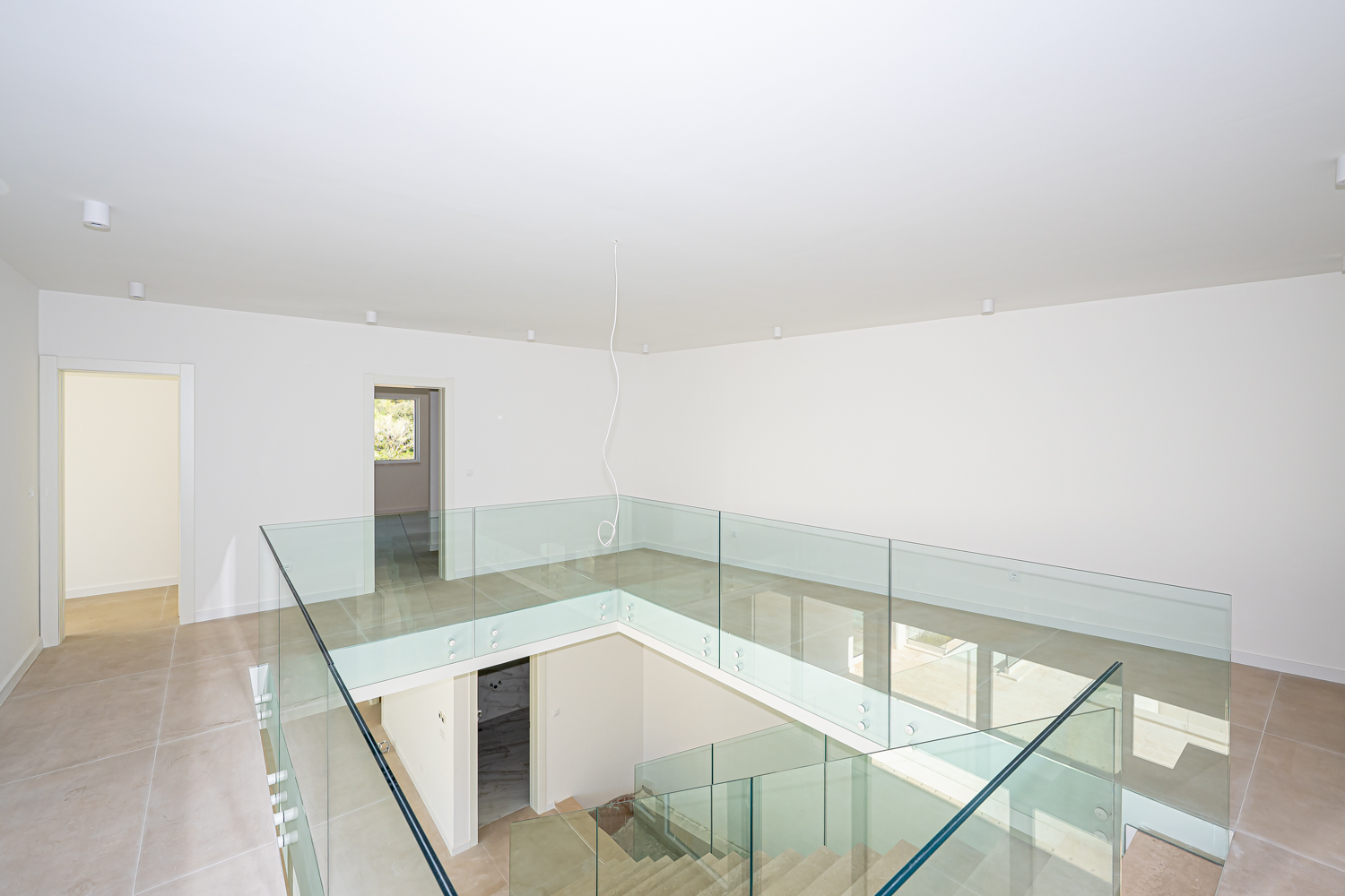 V nadstropju so štiri luksuzne spalnice, vsaka z lastno kopalnico, tri sobe pa imajo izhod na balkon s čudovitim pogledom na morje.