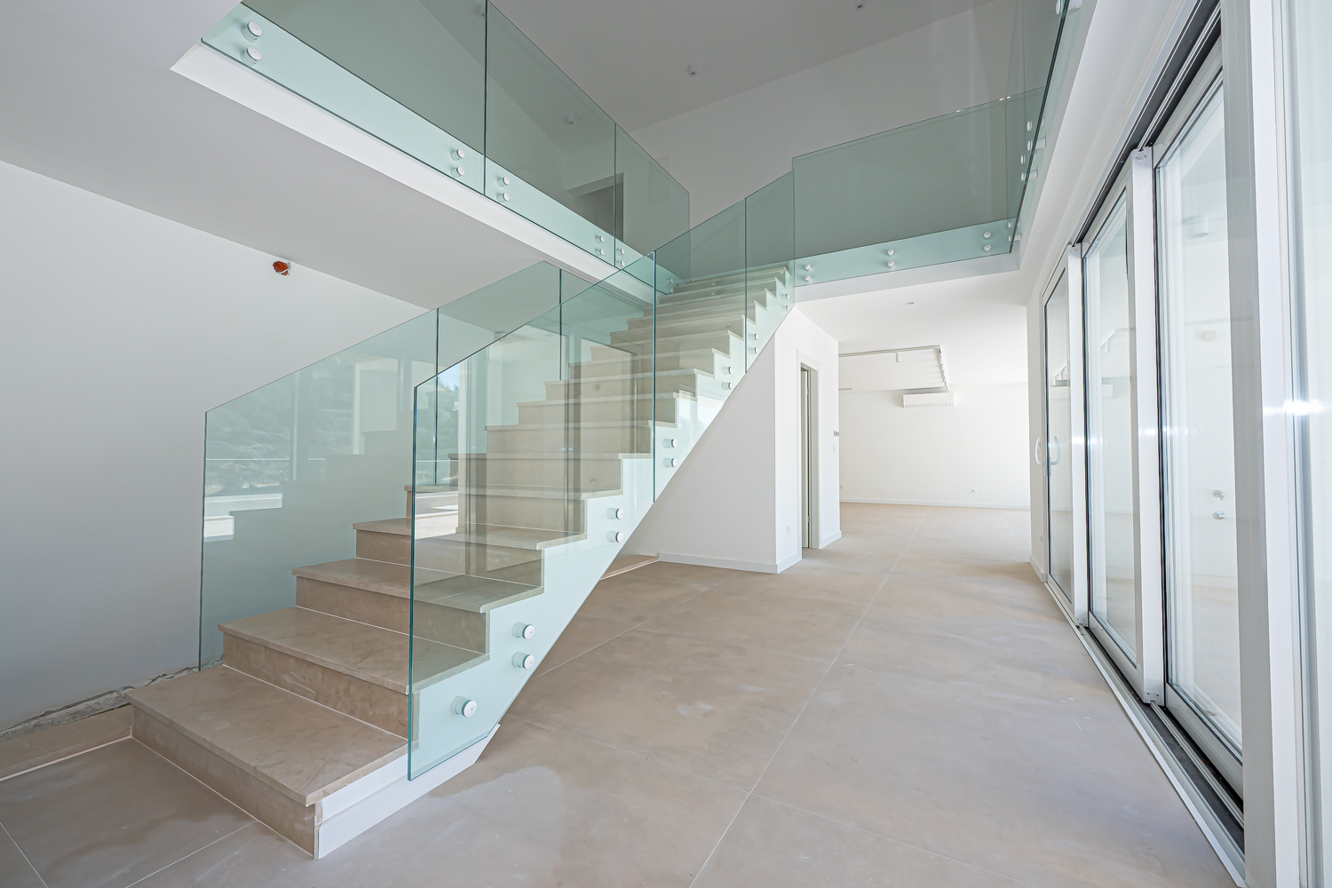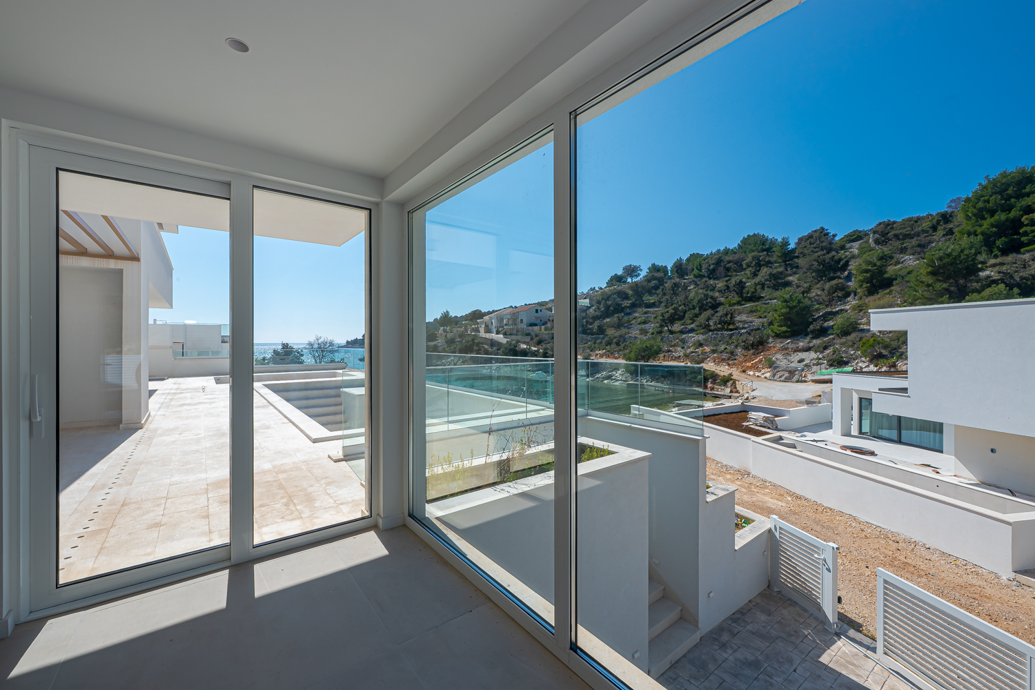 Pritličje sije v svetlobi zahvaljujoč velikim steklenim stenam, ki brišejo mejo med notranjostjo in zunanjostjo ter nudijo spektakularen panoramski pogled na morje in otoke. Moderna kuhinja z jedilnico ima neposreden izhod na prostorno teraso, idealno za sprostitev in druženje, medtem ko eleganten dnevni prostor s kaminom gleda na bazen in zunanji lounge prostor, obdan s skrbno urejenim kaskadnim vrtom.